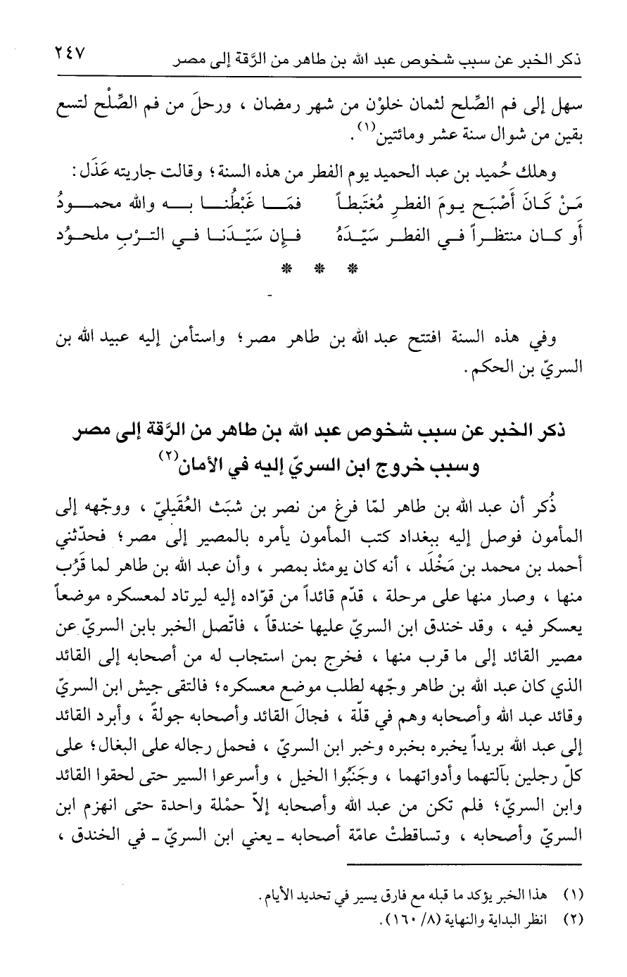 ذكر الخبر عن سبب شخوص عبد الله بن طاهر من الرَّقة إلى مصر وسبب خروج ابن السريّ إليه في الأمان (٢)