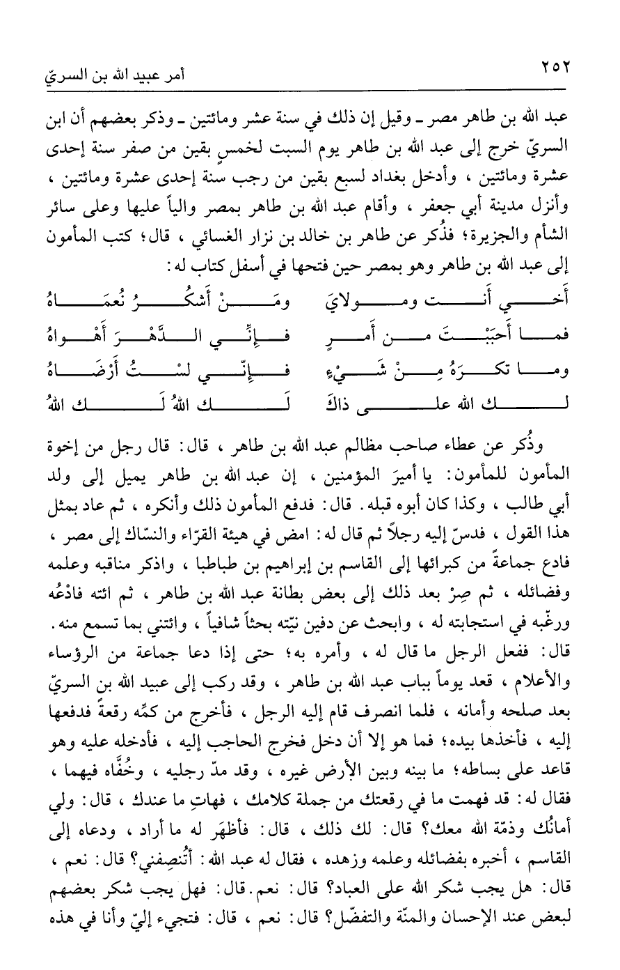 وذُكر عن عطاء صاحب مظالم عبد الله بن طاهر، قال: قال رجل من إخوة المأمون للمأمون: يا أميرَ المؤمنين، إن عبد الله بن طاهر يميل إلى ولد أبي طالب، وكذا كان أبوه قبله. قال: فدفع المأمون ذلك وأنكره، ثم عاد بمثل هذا القول، فدسّ إليه رجلًا ثم قال له: امض في هيئة القرّاء والنسّاك إلى مصر، فادع جماعةً من كبرائها إلى القاسم بن إبراهيم بن طباطبا، واذكر مناقبه وعلمه وفضائله، ثم صِرْ بعد ذلك إلى بعض بطانة عبد الله بن طاهر، ثم ائته فادْعُه ورغّبه في استجابته له، والمجا عن دفين نيّته بحثًا شافيًا، وائتني بما تسمع منه. قال: ففعل الرجل ما قال له، وأمره به؛ حتى إذا دعا جماعة من الرؤساء والأعلام، قعد يومًا بباب عبد الله بن طاهر، وقد ركب إلى عبيد الله بن السريّ بعد صلحه وأمانه، فلما انصرف قام إليه الرجل، فأخرج من كمِّه رقعةً فدفعها إليه، فأخذها بيده؛ فما هو إلا أن دخل فخرج الحاجب إليه، فأدخله عليه وهو قاعد على بساطه؛ ما بينه وبين الأرض غيره، وقد مدّ رجليه، وخُفَّاه فيهما، فقال له: قد فهمت ما في رقعتك من جملة كلامك، فهاتِ ما عندك، قال: ولي أمانُك وذمّة الله معك؟ قال: لك ذلك، قال: فأظهَر له ما أراد، ودعاه إلى القاسم، أخبره بفضائله وعلمه وزهده، فقال له عبد الله: أتُنصِفني؟ قال: نعم، قال: هل يجب شكر الله على العباد؟ قال: نعم. قال: فهل يجب شكر بعضهم لبعض عند الإحسان والمنّة والتفضّل؟ قال: نعم، قال: فتجيء إليّ وأنا في هذه