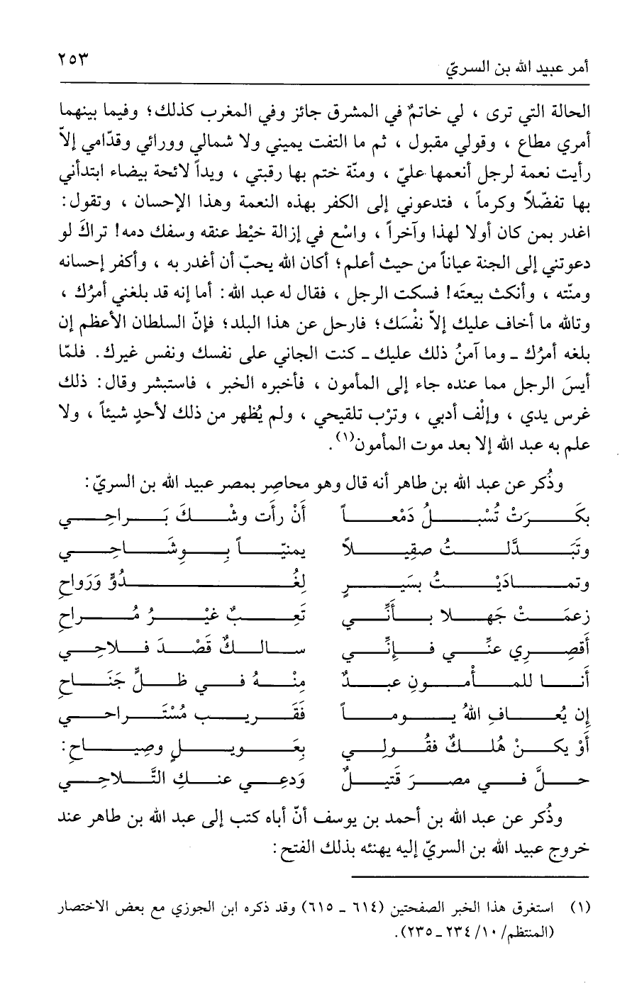 (١) استغرق هذا الخبر الصفحتين (٦١٤ - ٦١٥) وقد ذكره ابن الجوزي مع بعض الاختصار (المنتظم / ١٠/ ٢٣٤ - ٢٣٥).