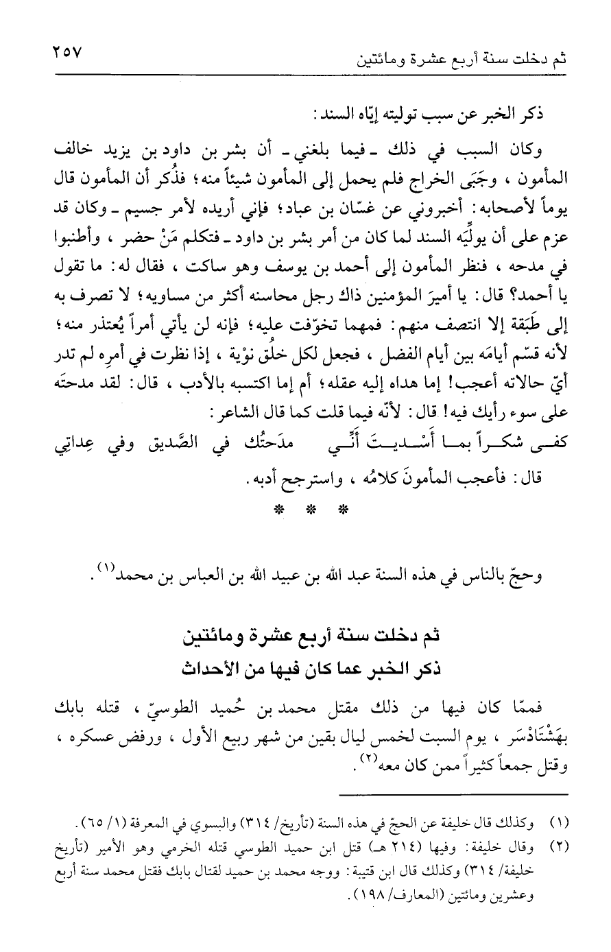 (٢) وقال خليفة: وفيها (٢١٤ هـ) قتل ابن حميد الطوسي قتله الخرمي وهو الأمير (تأريخ خليفة/ ٣١٤) وكذلك قال ابن قتيبة: ووجه محمد بن حميد لقتال بابك فقتل محمد سنة أربع وعشرين ومائتين (المعارف/ ١٩٨).
