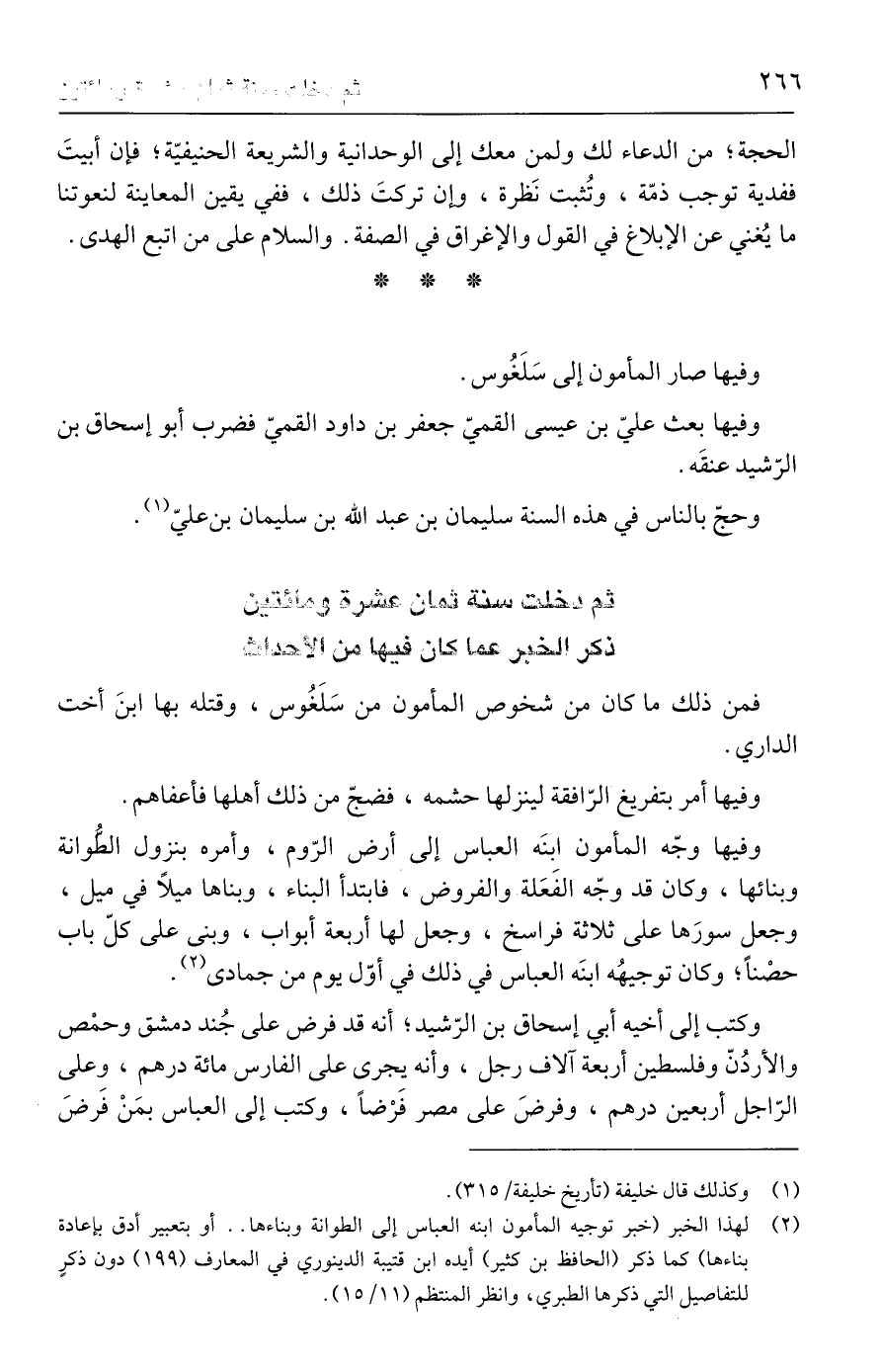 (٢) لهذا الخبر (خبر توجيه المأمون ابنه العباس إلى الطوانة وبناءها. . أو بتعبير أدق بإعادة بناءها) كما ذكر (الحافظ بن كثير) أيده ابن قتيبة الدينوري في المعارف (١٩٩) دون ذكرٍ للتفاصيل التي ذكرها الطبري، وانظر المنتظم (١١/ ١٥).