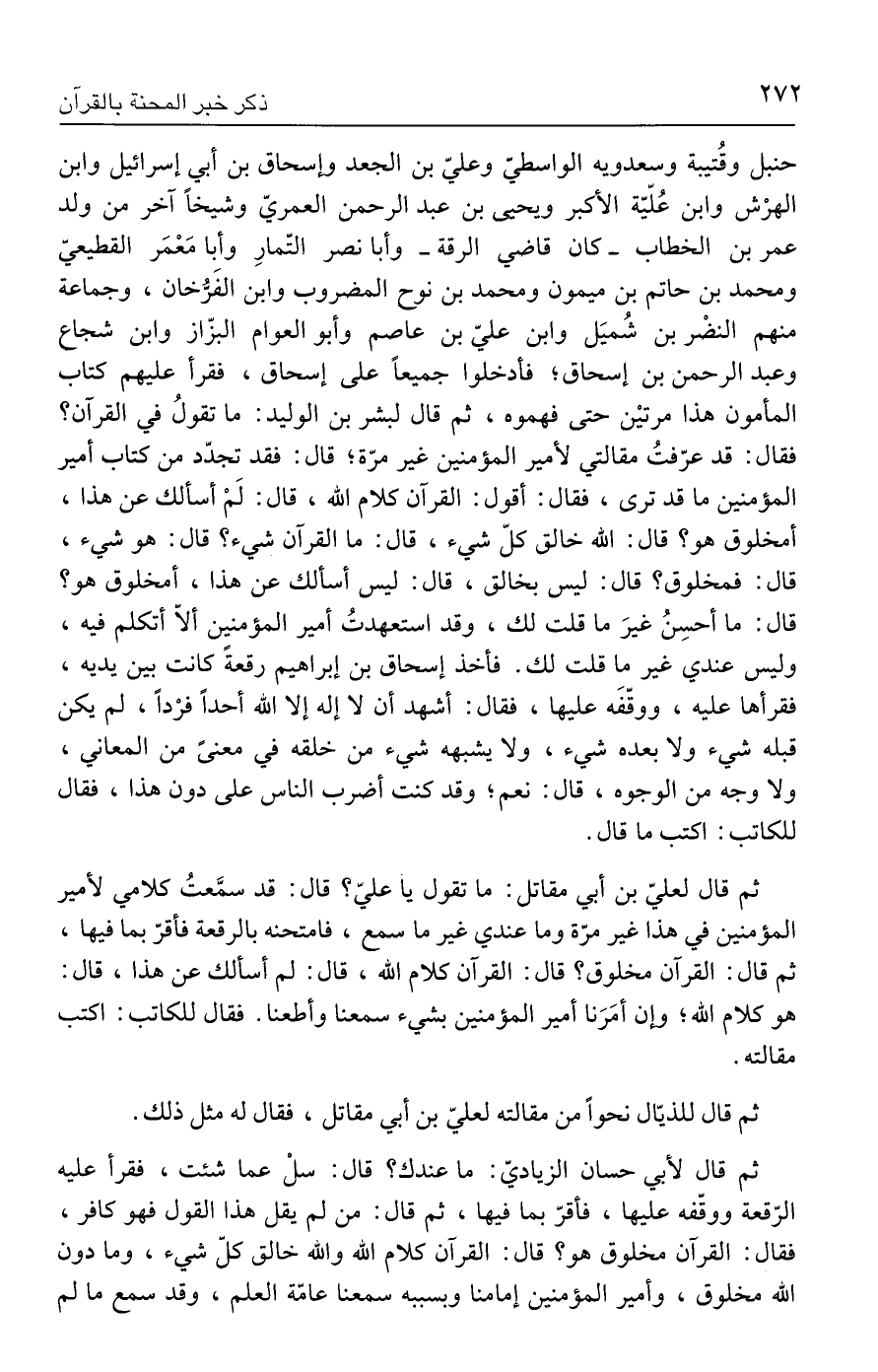حنبل وقُتيبة وسعدويه الواسطيّ وعليّ بن الجعد وإسحاق بن أبي إسرائيل وابن الهرْش وابن عُلّيّة الأكبر ويحيى بن عبد الرحمن العمريّ وشيخًا آخر من ولد عمر بن الخطاب - كان قاضي الرقة - وأبا نصر التّمارِ وأبا مَعْمَر القطيعيّ ومحمد بن حاتم بن ميمون ومحمد بن نوح المضروب وابن الفَرُّخان، وجماعة منهم النضْر بن شُميَل وابن عليّ بن عاصم وأبو العوام البزّاز وابن شجاع وعبد الرحمن بن إسحاق؛ فأدخلوا جميعًا على إسحاق، ققرأ عليهم كتاب المأمون هذا مرتيْن حتى فهموه، ثم قال لبشر بن الوليد: ما تقولُ في القرآن؟ فقال: قد عرّفتُ مقالتي لأمير المؤمنين غير مرّة؛ قال: فقد تجدّد من كتاب أمير المؤمنين ما قد ترى، فقال: أقول: القرآن كلام الله، قال: لَمْ أسألك عن هذا، أمخلوق هو؟ قال: الله خالق كلّ شيء، قال: ما القرآن شيء؟ قال: هو شيء، قال: فمخلوق؟ قال: ليس بخالق، قال: ليس أسألك عن هذا، أمخلوق هو؟ قال: ما أحسِنُ غيرَ ما قلت لك، وقد استعهدتُ أمير المؤمنين ألّا أتكلم فيه، وليس عندي غير ما قلت لك. فأخذ إسحاق بن إبراهيم رقعةً كانت بين يديه، فقرأها عليه، ووقّفَه عليها، فقال: أشهد أن لا إله إلا الله أحدًا فرْدًا، لم يكن قبله شيء ولا بعده شيء، ولا يشبهه شيء من خلقه في معنىً من المعاني، ولا وجه من الوجوه، قال: نعم؛ وقد كنت أضرب الناس على دون هذا، فقال للكاتب: اكتب ما قال.