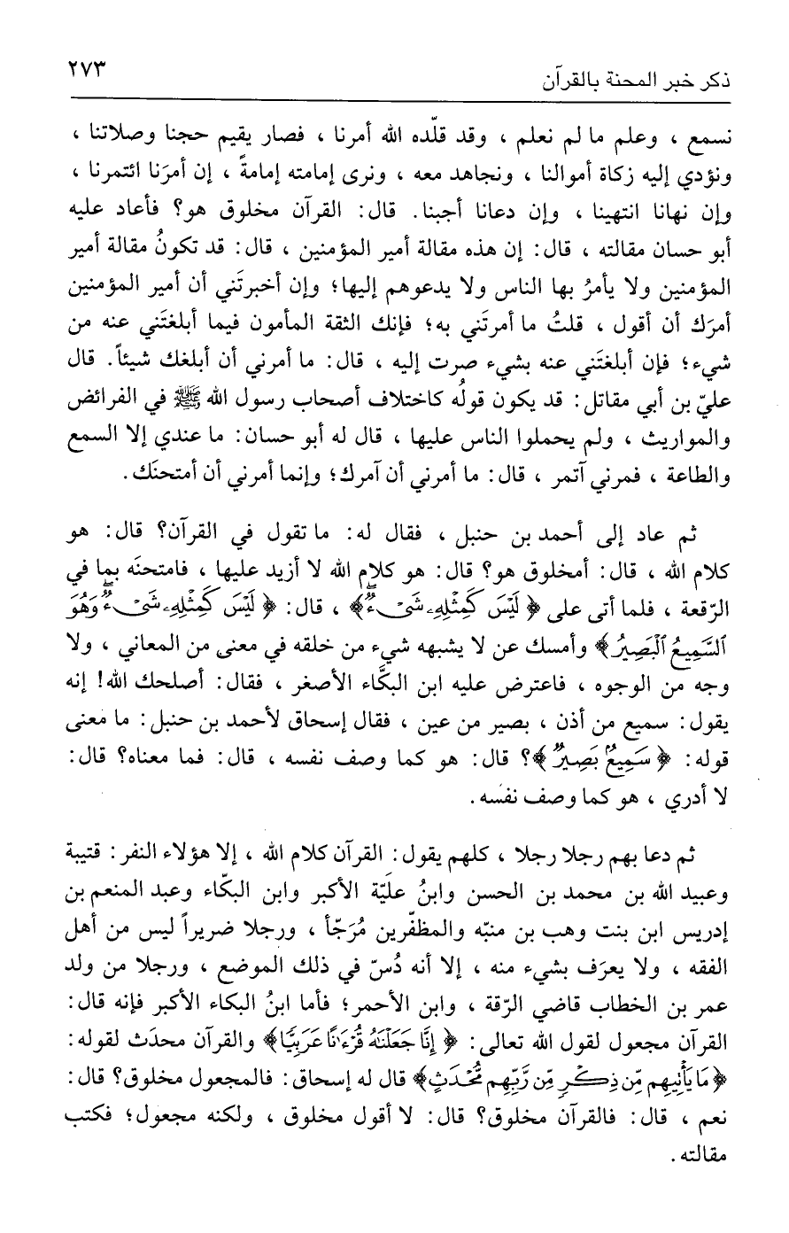ثم عاد إلى أحمد بن حنبل، فقال له: ما تقول في القرآن؟ قال: هو كلام الله، قال: أمخلوق هو؟ قال: هو كلام الله لا أزيد عليها، فامتحنَه بما في الرّقعة، فلما أتى على {لَيْسَ كَمِثْلِهِ شَيْءٌ}، قال: {لَيْسَ كَمِثْلِهِ شَيْءٌ وَهُوَ السَّمِيعُ الْبَصِيرُ} وأمسك عن لا يشبهه شيء من خلقه في معنى من المعاني، ولا وجه من الوجوه، فاعترض عليه ابن البكَّاء الأصغر، فقال: أصلحك الله! إنه يقول: سميع من أذن، بصير من عين، فقال إسحاق لأحمد بن حنبل: ما معنى قوله: {سَمِيعٌ بَصِيرٌ}؟ قال: هو كما وصف نفسه، قال: فما معناه؟ قال: لا أدري، هو كما وصف نفسه.