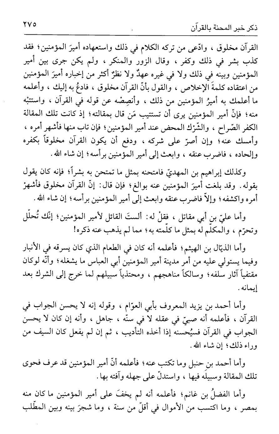 وكذلك إبراهيم بن المهديّ فامتحنه بمثل ما تمتحن به بشرًا؛ فإنه كان يقول بقوله. وقد بلغت أميرَ المؤمنين عنه بوالغ؛ فإن قال: إنّ القرآن مخلوق فأشهرْ أمره واكشفه؛ وإلّا فاضرب عنقه وابعث إلى أمير المؤمنين برأسه؛ إن شاء الله.
