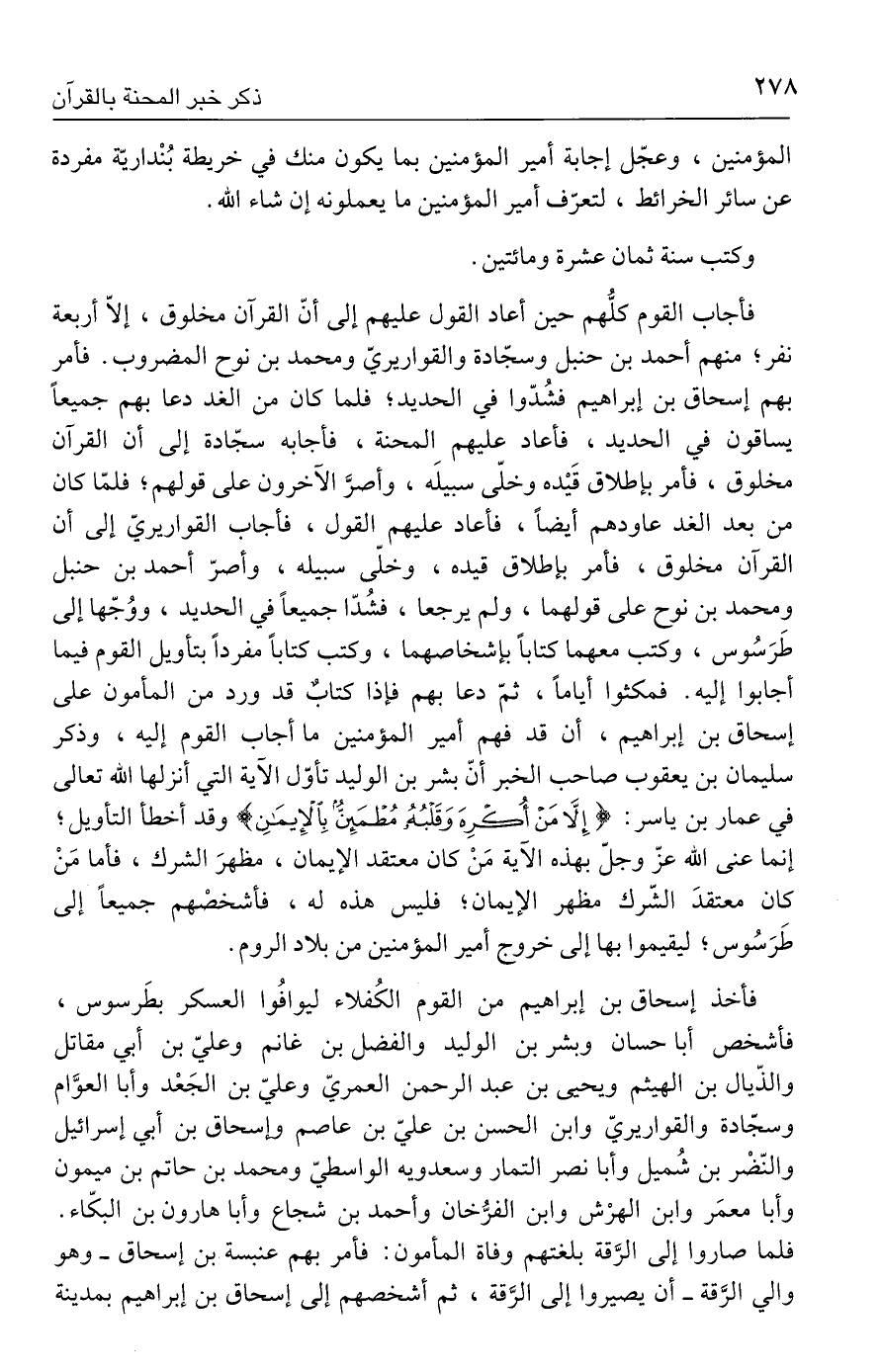 فأجاب القوم كلُّهم حين أعاد القول عليهم إلى أنّ القرآن مخلوق، إلّا أربعة نفر؛ منهم أحمد بن حنبل وسجّادة والقواريريّ ومحمد بن نوح المضروب. فأمر بهم إسحاق بن إبراهيم فشُدّوا في الحديد؛ فلما كان من الغد دعا بهم جميعًا يساقون في الحديد، فأعاد عليهم المحنة، فأجابه سجّادة إلى أن القرآن مخلوق، فأمر بإطلاق قَيْده وخلّى سبيلَه، وأصرَّ الآخرون على قولهم؛ فلمّا كان من بعد الغد عاودهم أيضًا، فأعاد عليهم القول، فأجاب القواريريّ إلى أن القرآن مخلوق، فأمر بإطلاق قيده، وخلّى سبيله، وأصرّ أحمد بن حنبل ومحمد بن نوح على قولهما، ولم يرجعا، فشُدّا جميعًا في الحديد، ووُجّها إلى طَرَسُوس، وكتب معهما كتابًا بإشخاصهما، وكتب كتابًا مفردًا بتأويل القوم فيما أجابوا إليه. فمكثوا أيامًا، ثمّ دعا بهم فإذا كتابٌ قد ورد من المأمون على إسحاق بن إبراهيم، أن قد فهم أمير المؤمنين ما أجاب القوم إليه، وذكر سليمان بن يعقوب صاحب الخبر أنّ بشر بن الوليد تأوّل الآية التي أنزلها الله تعالى في عمار بن ياسر: {إِلَّا مَنْ أُكْرِهَ وَقَلْبُهُ مُطْمَئِنٌّ بِالْإِيمَانِ} وقد أخطأ التأويل؛ إنما عنى الله عزّ وجلّ بهذه الآية مَنْ كان معتقد الإيمان، مظهرَ الشرك، فأما مَنْ كان معتقدَ الشّرك مظهر الإيمان، فليس هذه له، فأشخصْهم جميعًا إلى طَرَسُوس؛ ليقيموا بها إلى خروج أمير المؤمنين من بلاد الروم.