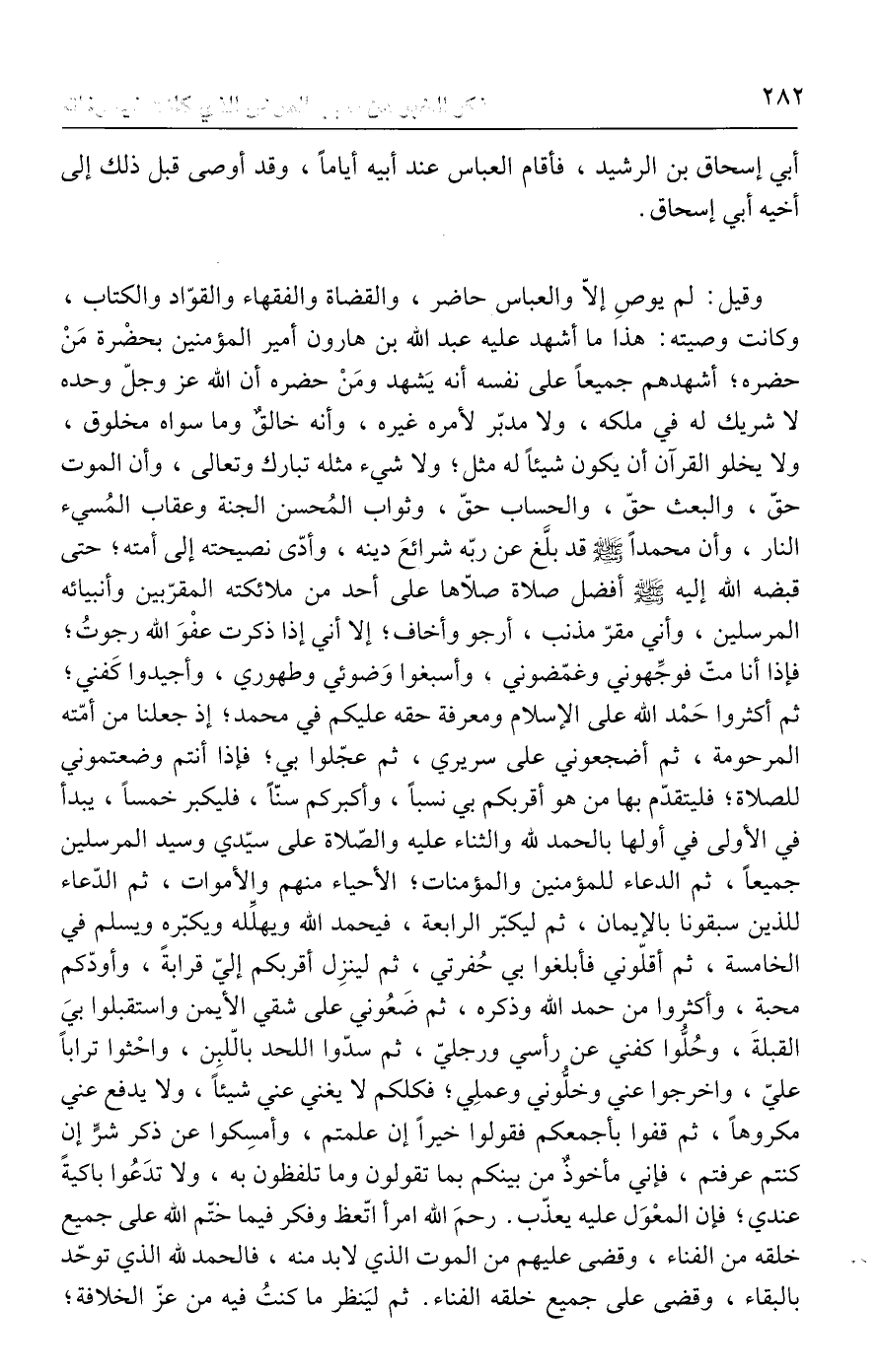 وقيل: لم يوصِ إلّا والعباس حاضر، والقضاة والفقهاء والقوّاد والكتاب، وكانت وصيته: هذا ما أشهد عليه عبد الله بن هارون أمير المؤمنين بحضْرة مَنْ حضره؛ أشهدهم جميعًا على نفسه أنه يَشهد ومَنْ حضره أن الله عز وجلّ وحده لا شريك له في ملكه، ولا مدبّر لأمره غيره، وأنه خالقٌ وما سواه مخلوق، ولا يخلو القرآن أن يكون شيئًا له مثل، ولا شيء مثله تبارك وتعالى، وأن الموت حقّ، والبعث حقّ، والحساب حقّ، وثواب المُحسن الجنة وعقاب المُسيء النار، وأن محمدًا - صلى الله عليه وسلم - قد بلَّغ عن ربّه شرائعَ دينه، وأدّى نصيحته إلى أمته؛ حتى قبضه الله إليه - صلى الله عليه وسلم - أفضل صلاة صلّاها على أحد من ملائكته المقرّبين وأنبيائه المرسلين، وأني مقرّ مذنب، أرجو وأخاف، إلا أني إذا ذكرت عفْوَ الله رجوتُ؛ فإذا أنا متّ فوجِّهوني وغمّضوني، وأسبغوا وَضوئي وطهوري، وأجيدوا كَفني؛ ثم أكثروا حَمْد الله على الإسلام ومعرفة حقه عليكم في محمد؛ إذ جعلنا من أمّته المرحومة، ثم أضجعوني على سريري، ثم عجّلوا بي، فإذا أنتم وضعتموني للصلاة؛ فليتقدّم بها من هو أقربكم بي نسبًا، وأكبركم سنًّا، فليكبر خمسًا، يبدأ في الأولى في أولها بالحمد لله والثناء عليه والصّلاة على سيّدي وسيد المرسلين جميعًا، ثم الدعاء للمؤمنين والمؤمنات؛ الأحياء منهم والأموات، ثم الدّعاء للذين سبقونا بالإيمان، ثم ليكبّر الرابعة، فيحمد الله ويهلِّله ويكبّره ويسلم في الخامسة، ثم أقلّوني فأبلغوا بي حُفرتي، ثم لينزِل أقربكم إليّ قرابةً، وأودّكم محبة، وأكثروا من حمد الله وذكره، ثم ضَعُوني على شقي الأيمن واستقبلوا بيَ القبلةَ، وحُلُّوا كفني عن رأسي ورجليّ، ثم سدّوا اللحد بالّلبِن، واحْثوا ترابًا عليّ، واخرجوا عني وخلُّوني وعملِي؛ فكلكم لا يغني عني شيئًا، ولا يدفع عني مكروهًا، ثم قفوا بأجمعكم فقولوا خيرًا إن علمتم، وأمسِكوا عن ذكر شرٍّ إن كنتم عرفتم، فإني مأخوذٌ من بينكم بما تقولون وما تلفظون به، ولا تدَعُوا باكيةً عندي؛ فإن المعْوَل عليه يعذّب. رحمَ الله امرأ اتّعظ وفكر فيما ختّم الله على جميع خلقه من الفناء، وقضى عليهم من الموت الذي لا بد منه، فالحمد لله الذي توحّد بالبقاء، وقضى على جميع خلقه الفناء. ثم ليَنظر ما كنتُ فيه من عزّ الخلافة؛