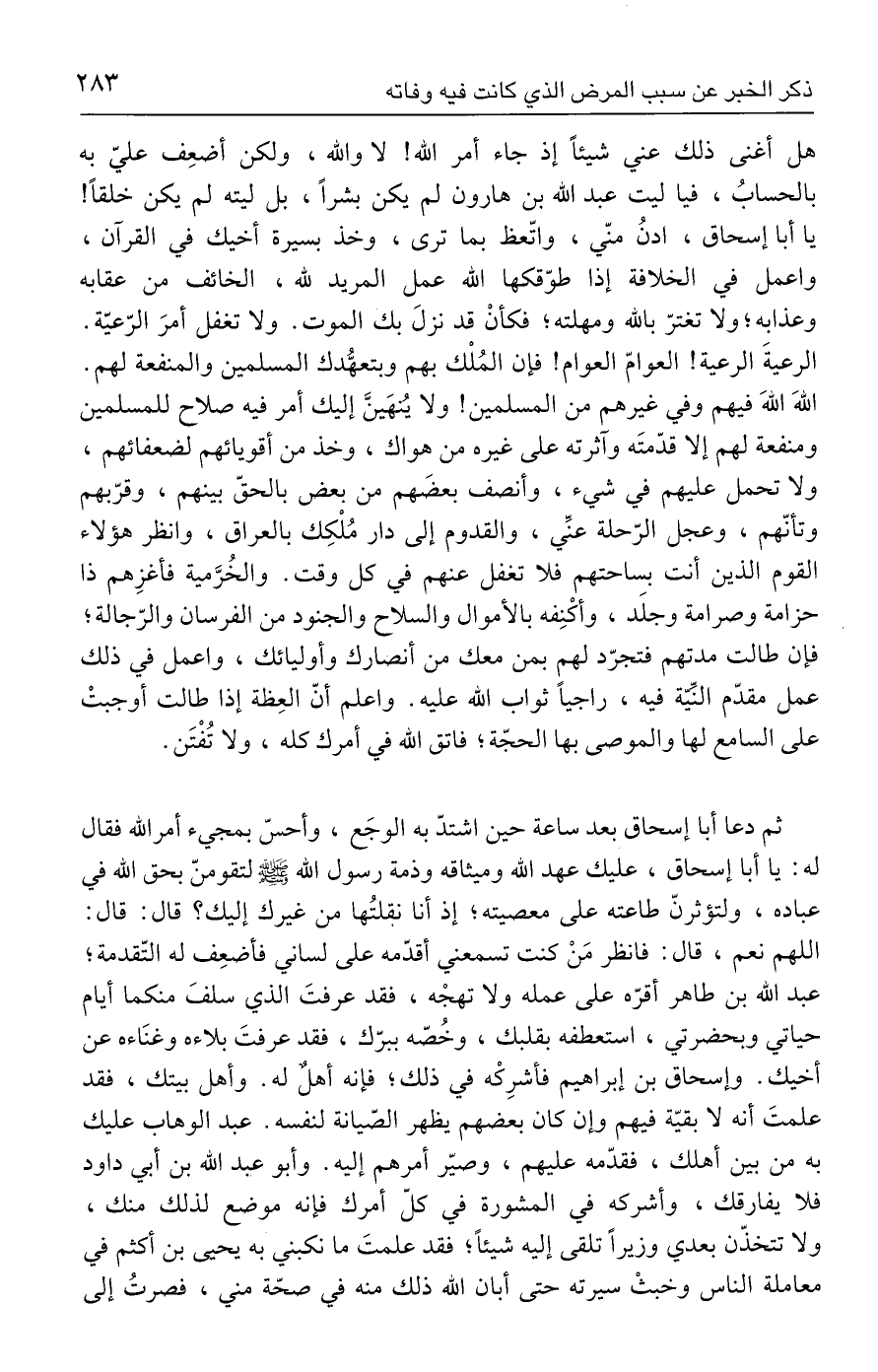 ثم دعا أبا إسحاق بعد ساعة حين اشتدّ به الوجَع، وأحسّ بمجيء أمر الله فقال له: يا أبا إسحاق، عليك عهد الله وميثاقه وذمة رسول الله - صلى الله عليه وسلم - لتقومنّ بحق الله في عباده، ولتؤثرنّ طاعته على معصيته؛ إذ أنا نقلتُها من غيرك إليك؟ قال: قال: اللهم نعم، قال: فانظر مَنْ كنت تسمعني أقدّمه على لساني فأضعِف له التّقدمة؛ عبد الله بن طاهر أقرّه على عمله ولا تهجْه، فقد عرفتَ الذي سلفَ منكما أيام حياتي وبحضرتي، استعطفه بقلبك، وخُصّه ببرّك، فقد عرفتَ بلاءه وغنَاءه عن أخيك. وإسحاق بن إبراهيم فأشرِكْه في ذلك؛ فإنه أهل له. وأهل بيتك، فقد علمتَ أنه لا بقيّة فيهم وإن كان بعضهم يظهر الصّيانة لنفسه. عبد الوهاب عليك به من بين أهلك، فقدّمه عليهم، وصيّر أمرهم إليه. وأبو عبد الله بن أبي داود فلا يفارقك، وأشركه في المشورة في كلّ أمرك فإنه موضح لذلك منك، ولا تتخذّن بعدي وزيرًا تلقى إليه شيئًا؛ فقد علمتَ ما نكبني به يحيى بن أكثم في معاملة الناس وخبثْ سيرته حتى أبان الله ذلك منه في صحّة مني، فصرتُ إلى