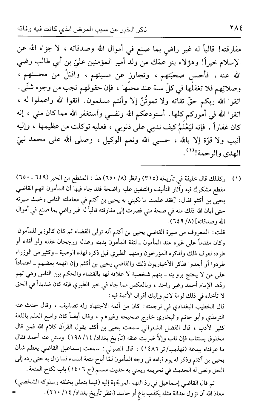 مفارقته! قاليًا له غير راضٍ بما صنع في أموال الله وصدقاته، لا جزاه الله عن الإسلام خيرًا! وهؤلاء بنو عمّك من ولد أمير المؤمنين عليّ بن أبي طالب رضي الله عنه، فأحسن صحبَتهم، وتجاوز عن مسيئهم، واقبَلْ من محسنهم، وصلاتِهم فلا تغفلْها في كلّ سنة عند محلّها، فإن حقوقهم تجب من وجوه شتّى. اتقوا الله ربكم حقّ تقاته ولا تموتُنّ إلا وأنتم مسلمون. اتقوا الله واعملوا له، اتقوا الله في أموركم كلها. أستودعكم الله ونفسي وأستغفر الله مما كان مني، إنه كان غفارًا، فإنه ليَعْلَمُ كيف ندمِي على ذنوبي، فعليه توكلت من عظيمها، وإليه أنيب ولا قوّة إلا بالله، حسبي الله ونعم الوكيل، وصلى الله على محمد نبيّ الهدى والرحمة! (١).