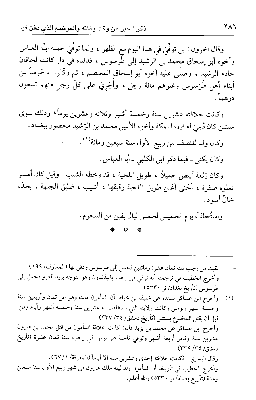 (١) وأخرج ابن عساكر بسنده عن خليفة بن خياط أن المأمون مات وهو ابن ثمان وأربعين سنة وخمسة أشهر ويومين وكانت ولايته التي استقامت له عشرين سنة وخمسة أشهر وأيام ومن قبل أن يقتل المخلوع بسنتين (تأريخ دمشق/ ٣٤/ ٣٣٧).