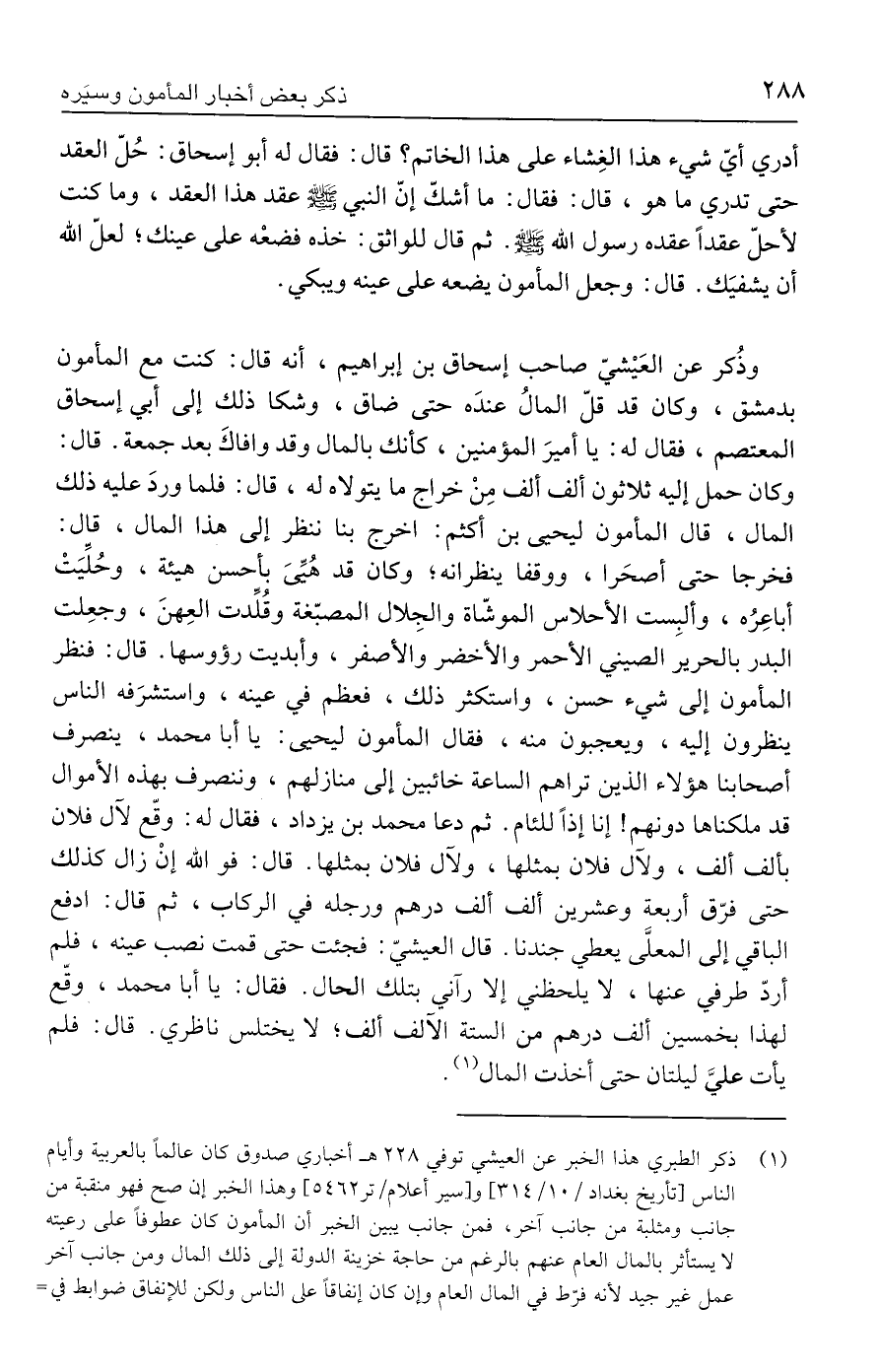 (١) ذكر الطبري هذا الخبر عن العيشي توفي ٢٢٨ هـ أخباري صدوق كان عالمًا بالعربية وأيام الناس [تأريخ بغداد/ ١٠/ ٣١٤ [و [سير أعلام/ تر ٥٤٦٢] وهذا الخبر إذ صح فهو منقبة من جانب ومخلبة من جانب آخر، فمن جانب يبين الخبر أن المأمون كان عطوفًا على رعيته لا يستأثر بالمال العام عنهم بالرغم من حاجة خزينة الدولة إلى ذلك المال ومن جانب آخر عمل غير جيد لأنه فرّط في المال العام وإن كان إنفاقًا على الناس ولكن للإنفاق ضوابط في =