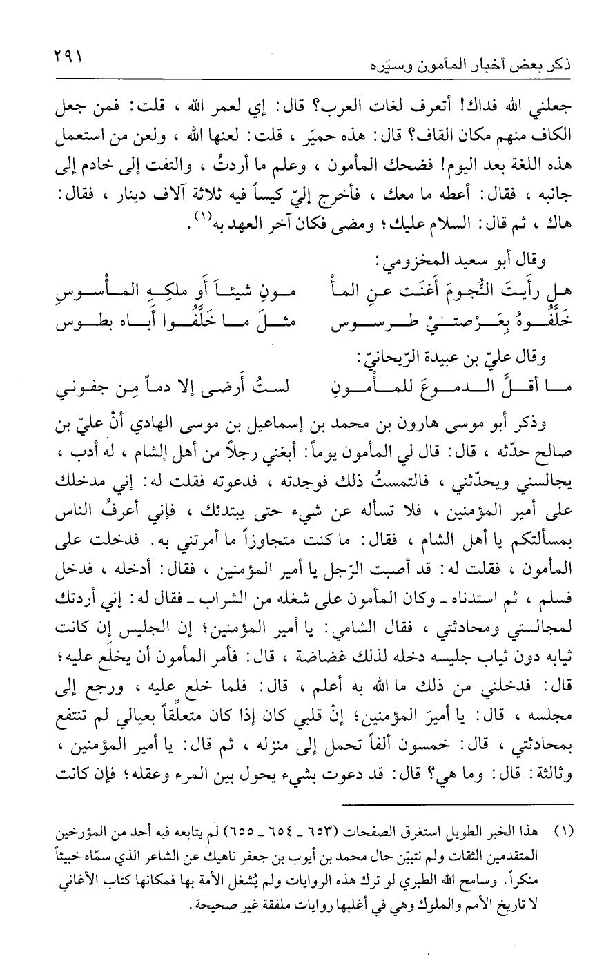 (١) هذا الخبر الطويل استغرق الصفحات (٦٥٣ - ٦٥٤ - ٦٥٥) لم يتابعه فيه أحد من المؤرخين المتقدمين الثقات ولم نتبيّن حال محمد بن أيوب بن جعفر ناهيك عن الشاعر الذي سمّاه خبيثًا منكرًا. وسامح الله الطبري لو ترك هذه الروايات ولم يُشغل الأمة بها فمكانها كتاب الأغاني لا تاريخ الأمم والملوك وهي في أغلبها روايات ملفقة غير صحيحة.