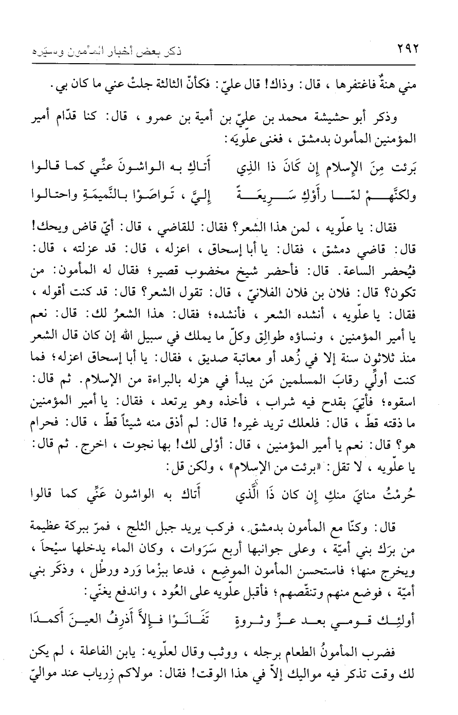 قال: وكنّا مع المأمون بدمشق، فركب يريد جبل الثلج، فمرّ ببركة عظيمة من برَك بني أميّة، وعلى جوانبها أربع سَرَوات، وكان الماء يدخلها سيْحَا، ويخرج منها؛ فاستحسن المأمون الموضِع، فدعا ببزْما وَرد ورطْل، وذكَر بني أميّة، فوضع منهم وتنقّصهم؛ فأقبل علّويه على العُود، واندفع يغنّي: