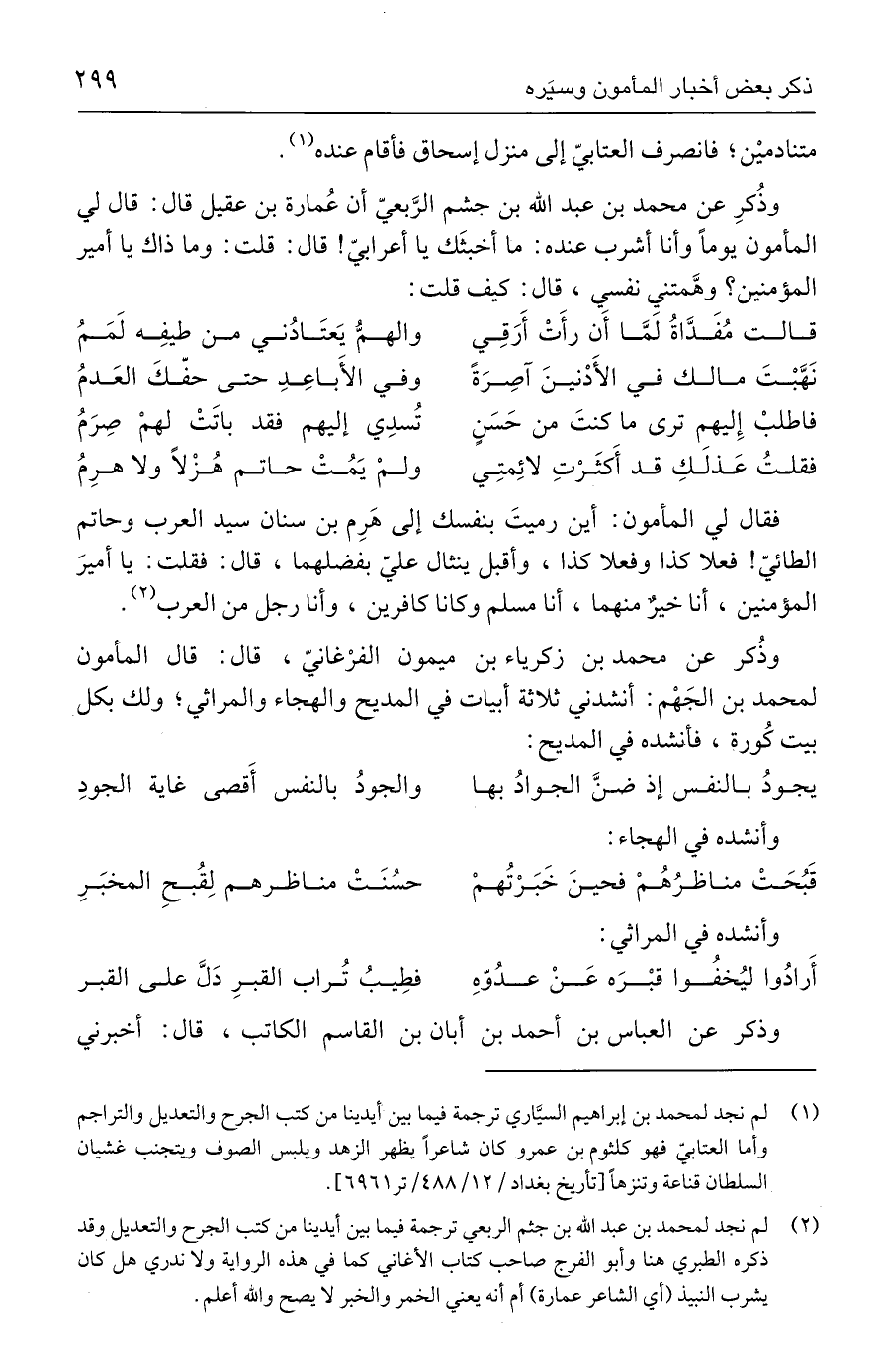 (٢) لم نجد لمحمد بن عبد الله بن جثم الربعي ترجمة فيما بين أيدينا من كتب الجرح والتعديل وقد ذكره الطبري هنا وأبو الفرج صاحب كتاب الأغاني كما في هذه الرواية ولا ندري هل كان يشرب النبيذ (أي الشاعر عمارة) أم أنه يعني الخمر والخبر لا يصح والله أعلم.