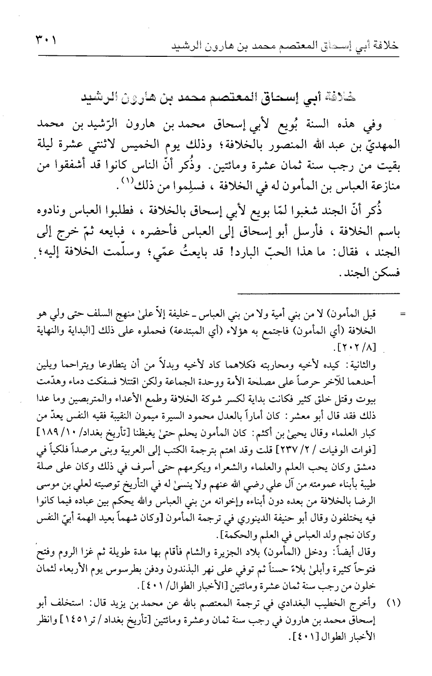 (١) وأخرج الخطيب البغدادي في ترجمة المعتصم بالله عن محمد بن يزيد قال: استخلف أبو إسحاق محمد بن هارون في رجب سنة ثمان وعشرة ومائتين [تأريخ بغداد/ تر ا ١٤٥] وانظر الأخبار الطوال [٤٠١].