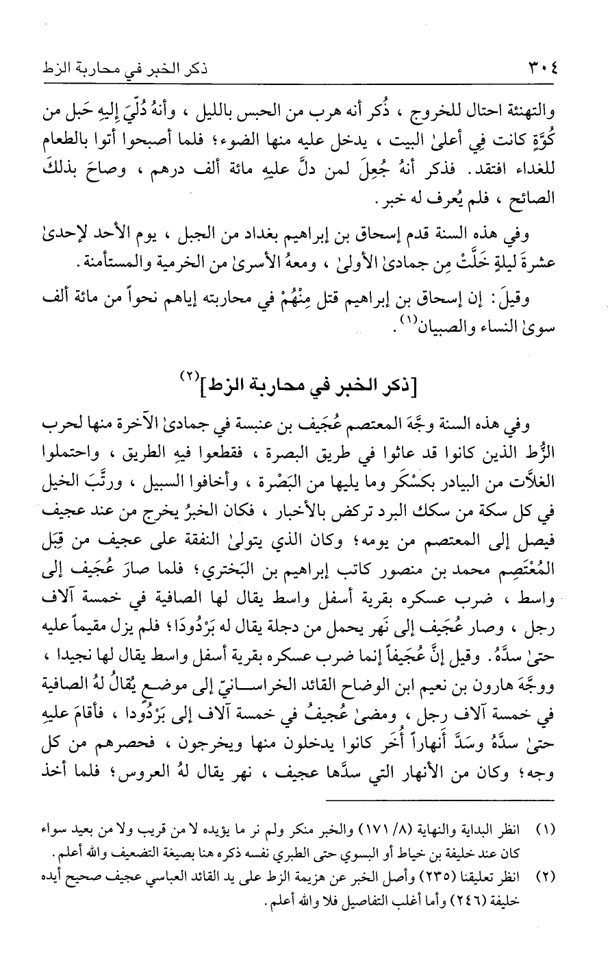 (٢) انظر تعليقنا (٢٣٥) وأصل الخبر عن هزيمة الزط على يد القائد العباسي عجيف صحيح أيده خليفة (٢٤٦) وأما أغلب التفاصيل فلا والله أعلم.