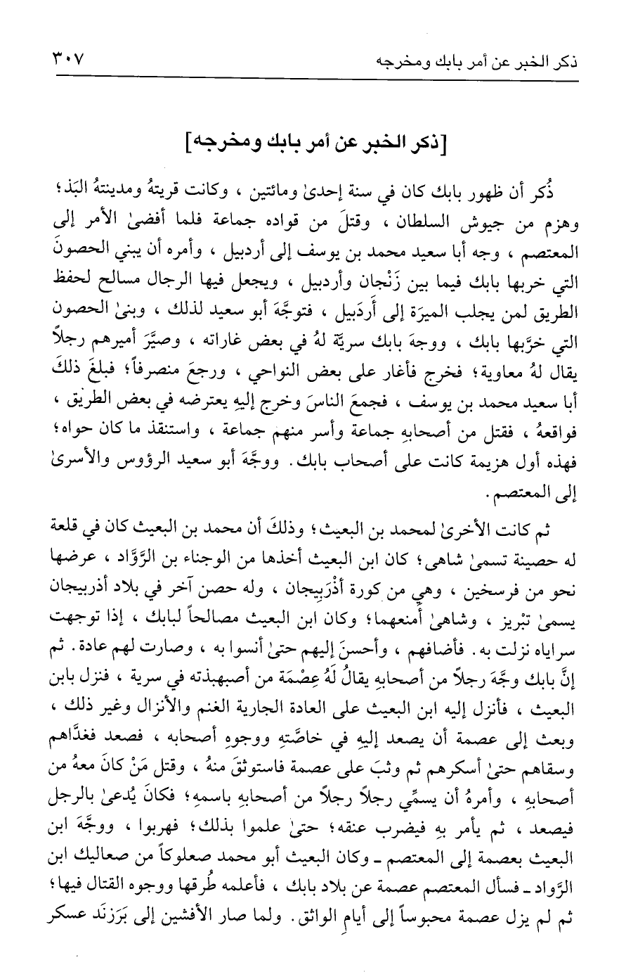 ثم كانت الأخرى لمحمد بن البعيث؛ وذلكَ أن محمد بن البعيث كان في قلعة له حصينة تسمى شاهى؛ كان ابن البعيث أخذها من الوجناء بن الرَّوَّاد، عرضها نحو من فرسخين، وهي من كورة أذْرَبِيجان، وله حصن آخر في بلاد أذربيجان يسمى تبْريز، وشاهى أمنعهما؛ وكان ابن البعيث مصالحًا لبابك، إذا توجهت سراياه نزلت به. فأضافهم، وأحسنَ إليهم حتى أنسوا به، وصارت لهم عادة. ثم إنَّ بابك وجَّهَ رجلًا من أصحابهِ يقالُ لَهُ عِصْمَة من أصبهبذته في سرية، فنزل بابن البعيث، فأنزل إليه ابن البعيث على العادة الجارية الغنم والأنزال وغير ذلك، وبعث إلى عصمة أن يصعد إليهِ في خاصَّتهِ ووجوهِ أصحابه، فصعد فغدَّاهم وسقاهم حتى أسكرهم ثم وثبَ على عصمة فاستوثقَ منهُ، وقتل مَن كانَ معهُ من أصحابهِ، وأمرهُ أن يسمِّي رجلًا رجلًا من أصحابهِ باسمهِ؛ فكانَ يُدعى بالرجل فيصعد، ثم يأمر بهِ فيضرب عنقه؛ حتى علموا بذلك؛ فهربوا، ووجَّهَ ابن البعيث بعصمة إلى المعتصم - وكان البعيث أبو محمد صعلوكًا من صعاليك ابن الرَّواد - فسأل المعتصم عصمة عن بلاد بابك، فأعلمه طُرقها ووجوه القتال فيها؛ ثم لم يزل عصمة محبوسًا إلى أيامِ الواثق. ولما صار الأفشين إلى بَرَزنَد عسكر