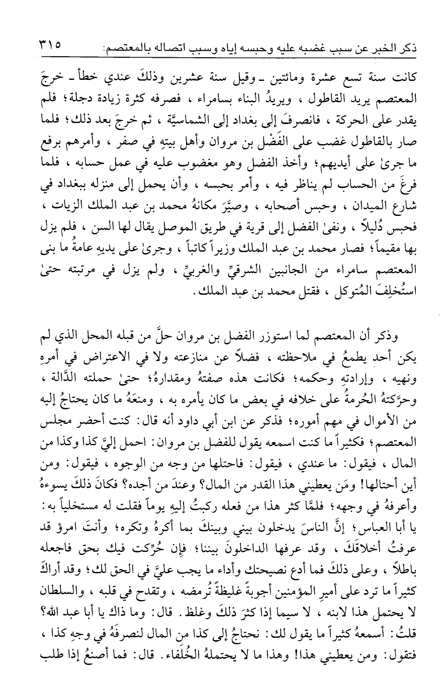 وذكر أن المعتصم لما استوزر الفضل بن مروان حلَّ من قبله المحل الذي لم يكن أحد يطمعُ في ملاحظته، فضلًا عن منازعته ولا في الاعتراض في أمرهِ ونهيه، وإرادتهِ وحكمه؛ فكانت هذه صفتهُ ومقدارهُ؛ حتى حملته الدَّالة، وحرَّكتهُ الحُرمةُ على خلافه في بعض ما كان يأمره به، ومنعَهُ ما كان يحتاجُ إليه من الأموال في مهم أموره؛ فذكر عن ابن أبي داود أنه قال: كنت أحضر مجلس المعتصم؛ فكثيرًا ما كنت اسمعه يقول للفضل بن مروان: احمل إليَّ كذا وكذا من المال، فيقول: ما عندي، فيقول: فاحتلها من وجه من الوجوه، فيقول: ومن أين أحتالها! ومَن يعطيني هذا القدر من المال؟ وعندَ من أجده؟ فكانَ ذلكَ يسوءهُ وأعرفهُ في وجهه؛ فلمَّا كثر هذا من فعله ركبتُ إليهِ يومًا فقلت له مستخليًا به: يا أبا العباس؛ إنَّ الناسَ يدخلون بيني وبينكَ بما أكرهُ وتكره، وأنتَ امرؤ قد عرفتُ أخلاقَكَ، وقد عرفها الداخلونَ بيننا؛ فإِن حُرِّكت فيك بحق فاجعله باطلًا، وعلى ذلكَ فما أدع نصيحتك وأداء ما يجب عليَّ في الحق لك؛ وقد أراكَ كثيرًا ما ترد على أميرِ المؤمنين أجوبةً غليظةً تُرمضه، وتقدح في قلبه، والسلطان لا يحتمل هذا لابنه، لا سيما إذا كثرَ ذلكَ وغلظ. قال: وما ذاك يا أبا عبد الله؟ قلتُ: أسمعهُ كثيرًا ما يقول لك: نحتاجُ إلى كذا منِ المال لنصرفَهُ في وجهِ كذا، فتقول: ومن يعطيني هذا! وهذا ما لا يحتملهُ الخُلفاء. قال: فما أصنعُ إذا طلب