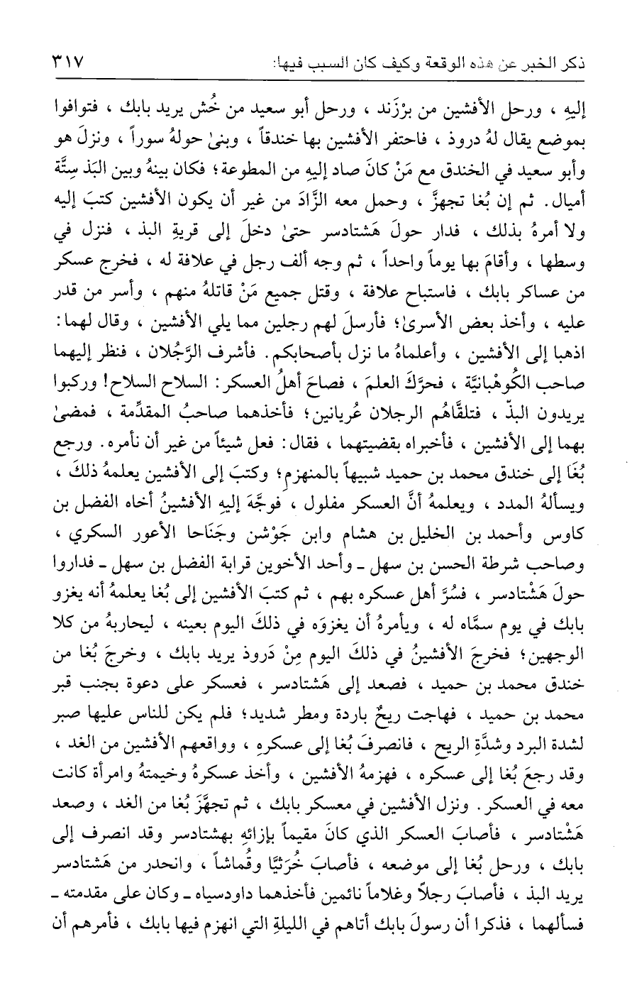 إليهِ، ورحل الأفشين من برْزَند، ورحل أبو سعيد من خُش يريد بابك، فتوافوا بموضع يقال لهُ دروذ، فاحتفر الأفشين بها خندقًا، وبنى حولهُ سورًا، ونزلَ هو وأبو سعيد في الخندق مع مَنْ كانَ صاد إليهِ من المطوعة؛ فكان بينهُ وبين البَذ سِتَّة أميال. ثم إن بُغا تجهزَّ، وحمل معه الزَّادَ من غير أن يكون الأفشين كتبَ إليه ولا أمرهُ بذلك، فدار حولَ هَشتادسر حتى دخلَ إلى قريةِ البذ، فنزل في وسطها، وأقامَ بها يومًا واحدًا، ثم وجه ألف رجل في علافة له، فخرج عسكر من عساكر بابك، فاستباح علافة، وقتل جميع مَنْ قاتلهُ منهم، وأسر من قدر عليه، وأخذ بعض الأسرى؛ فأرسلَ لهم رجلين مما يلي الأفشين، وقال لهما: اذهبا إلى الأفشين، وأعلماهُ ما نزل بأصحابكم. فأشرف الرَّجُلان، فنظر إليهما صاحب الكُوهْبانيَّة، فحرَّكَ العلمَ، فصاحَ أهلُ العسكر: السلاح السلاح! وركبوا يريدون البذّ، فتلقَّاهُم الرجلان عُريانين؛ فأخذهما صاحبُ المقدِّمة، فمضى بهما إلى الأفشين، فأخبراه بقضيتهما، فقال: فعل شيئًا من غير أن نأمره. ورجع بُغَا إلى خندق محمد بن حميد شبيهًا بالمنهزمِ؛ وكتبَ إلى الأفشين يعلمهُ ذلكَ، ويسألهُ المدد، ويعلمهُ أنَّ العسكر مفلول، فوجَّهَ إليهِ الأفشينُ أخاه الفضل بن كاوس وأحمد بن الخليل بن هشام وابن جَوْشن وجَنَاحا الأعور السكري، وصاحب شرطة الحسن بن سهل - وأحد الأخوين قرابة الفضل بن سهل - فداروا حولَ هَشْتادسر، فسُرَّ أهل عسكره بهم، ثم كتبَ الأفشين إلى بُغا يعلمهُ أنه يغزو بابك في يوم سمَّاه له، ويأمرهُ أن يغزوَه في ذلكَ اليوم بعينه، ليحاربهُ من كلا الوجهين؛ فخرجَ الأفشينُ في ذلكَ اليوم مِنْ دَروذ يريد بابك، وخرجَ بُغا من خندق محمد بن حميد، فصعد إلى هَشتادسر، فعسكر على دعوة بجنب قبر محمد بن حميد، فهاجت ريحٌ باردة ومطر شديد، فلم يكن للناس عليها صبر لشدة البرد وشدَّةِ الريح، فانصرفَ بُغا إلى عسكرهِ، وواقعهم الأفشين من الغد، وقد رجعَ بُغا إلى عسكره، فهزمهُ الأفشين، وأخذ عسكرهُ وخيمتهُ وامرأة كانت معه في العسكر. ونزل الأفشين في معسكر بابك، ثم تجهَّزَ بُغا من الغد، وصعد هَشْتادسر، فأصابَ العسكر الذي كانَ مقيمًا بإزائهِ بهشتادسر وقد انصرف إلى بابك، ورحل بُغا إلى موضعه، فأصابَ خُرَثيَّا وقُماشًا، وانحدر من هَشتادسر يريد البذ، فأصابَ رجلًا وغلامًا نائمين فأخذهما داودسياه - وكان على مقدمته - فسألهما، فذكرا أن رسولَ بابك أتاهم في الليلةِ التي انهزم فيها بابك، فأمرهم أن