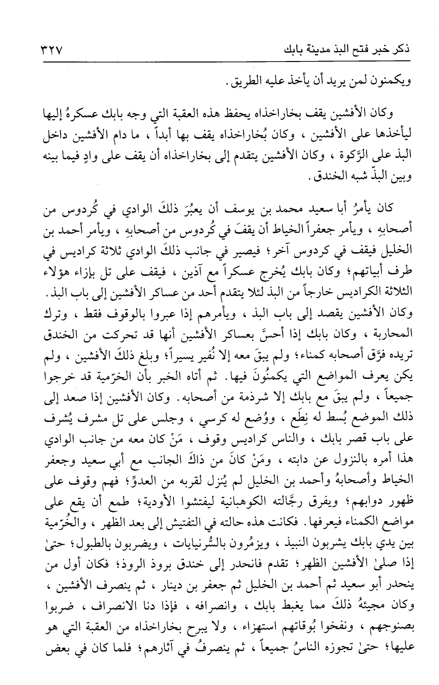 كان يأمرُ أبا سعيد محمد بن يوسف أن يعبُرَ ذلكَ الوادي في كُردوس من أصحابهِ، ويأمر جعفرًا الخياط أن يقفَ في كُردوس من أصحابهِ، ويأمر أحمد بن الخليل فيقف في كردوس آخر؛ فيصير في جانب ذلكَ الوادي ثلاثة كراديس في طرف أبياتهم؛ وكان بابك يُخرج عسكرًا مع آذين، فيقف على تل بإزاء هؤلاء الثلاثة الكراديس خارجًا من البذ لئلا يتقدم أحد من عساكر الأفشين إلى باب البذ. وكان الأفشين يقصد إلى باب البذ، ويأمرهم إذا عبروا بالوقوف فقط، وترك المحاربة، وكان بابك إذا أحسَّ بعساكر الأفشين أنها قد تحركت من الخندق تريده فرَّق أصحابه كمناء؛ ولم يبقَ معه إلا نُفير يسيرًا؛ وبلغ ذلكَ الأفشين، ولم يكن يعرف المواضع التي يكمنُونَ فيها. ثم أتاه الخبر بأن الخرّمية قد خرجوا جميعًا، ولم يبقَ مع بابك إلا شرذمة من أصحابه. وكان الأفشين إذا صعد إلى ذلك الموضع بُسط له نِطَع، ووُضع له كرسي، وجلس على تل مشرف يُشرف على باب قصر بابك، والناس كراديس وقوف، مَنْ كان معه من جانب الوادي هذا أمره بالنزول عن دابته، ومَنْ كانَ من ذاكَ الجانب مع أبي سعيد وجعفر الخياط وأصحابهُ وأحمد بن الخليل لم يُنزل لقربه من العدوِّ؛ فهم وقوف على ظهور دوابهم؛ ويفرق رجَّالته الكوهبانية ليفتشوا الأودية؛ طمع أن يقع على مواضع الكمناء فيعرفها. فكانت هذه حالته في التفتيش إلى بعد الظهر، والخُرّمية بين يدي بابك يشربون النبيذ، ويزمُرون بالسُّرنيايات، ويضربون بالطبول؛ حتى إذا صلى الأفشين الظهر؛ تقدم فانحدر إلى خندق بروذ الروذ؛ فكان أول من ينحدر أبو سعيد ثم أحمد بن الخليل ثم جعفر بن دينار، ثم ينصرف الأفشين، وكان مجيئهُ ذلكَ مما يغبط بابك، وانصرافه، فإذا دنا الانصراف، ضربوا بصنوجهم، ونفخوا بُوقاتهم استهزاء، ولا يبرح بخاراخذاه من العقبة التي هو عليها؛ حتى تجوزه الناسُ جميعًا، ثم ينصرفُ في آثارهم؛ فلما كان في بعض