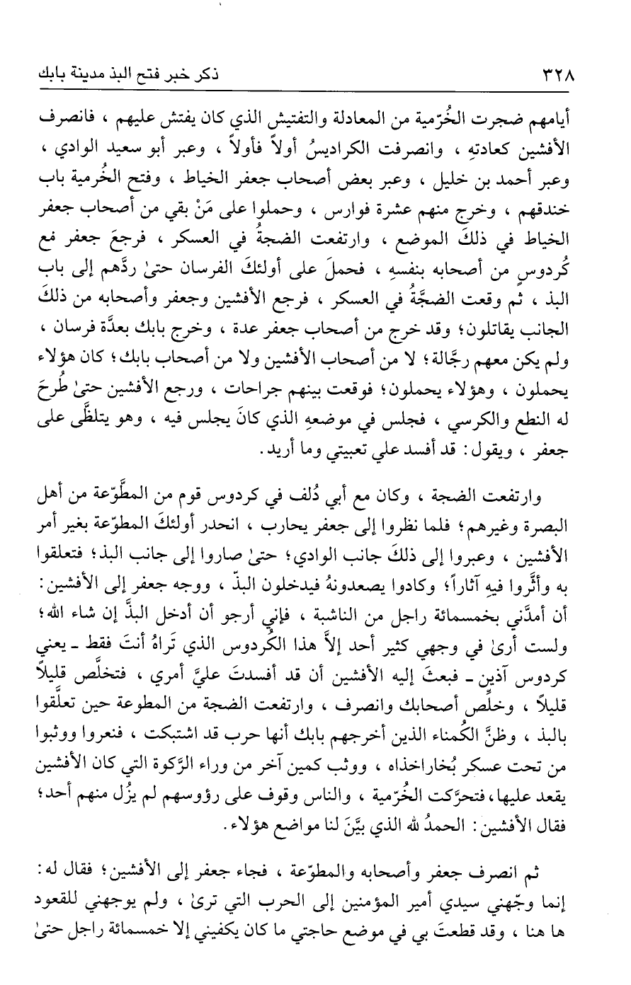 وارتفعت الضجة، وكان مع أبي دُلف في كردوس قوم من المطَّوّعة من أهل البصرة وغيرهم؛ فلما نظروا إلى جعفر يحارب، انحدر أولئكَ المطوّعة بغير أمر الأفشين، وعبروا إلى ذلكَ جانب الوادي، حتى صاروا إلى جانب البذ؛ فتعلقوا به وأثَّروا فيهِ آثارًا؛ وكادوا يصعدونهُ فيدخلون البذّ، ووجه جعفر إلى الأفشين: أن أمدَّني بخمسمائة راجل من الناشبة، فماني أرجو أن أدخل البذَّ إن شاء الله؛ ولست أرى في وجهي كثير أحد إلَّا هذا الكُردوس الذي تَراهُ أنتَ فقط - يعني كردوس آذين - فبعثَ إليه الأفشين أن قد أفسدتَ عليَّ أمري، فتخلَّص قليلًا قليلًا، وخلِّص أصحابك وانصرف، وارتفعت الضجة من المطوعة حين تعلَّقوا بالبذ، وظنَّ الكُمناء الذين أخرجهم بابك أنها حرب قد اشتبكت، فنعروا ووثبوا من تحت عسكر بُخاراخذاه، ووثب كمين آخر من وراء الرَّكوة التي كان الأفشين يقعد عليها، فتحرَّكت الخُرّمية، والناس وقوف على رؤوسهم لم يزُل منهم أحد؛ فقال الأفشين: الحمدُ لله الذي بيَّنَ لنا مواضع هؤلاء.