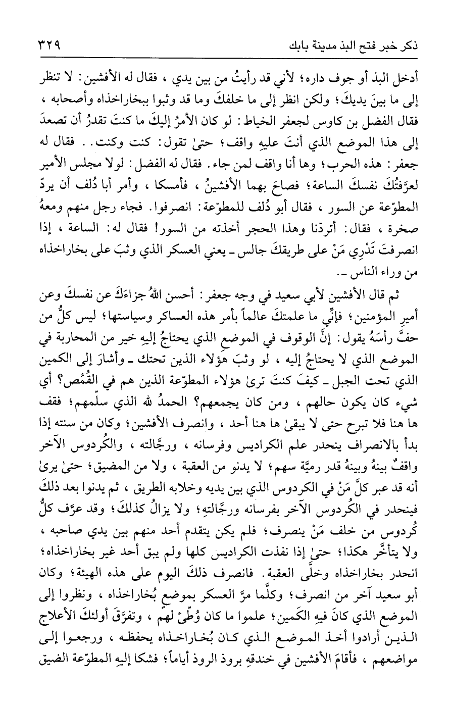 أدخل البذ أو جوف داره؛ لأني قد رأيتُ من بين يدي، فقال له الأفشين: لا تنظر إلى ما بينَ يديكَ؛ ولكن انظر إلى ما خلفكَ وما قد وثبوا ببخاراخذاه وأصحابه، فقال الفضل بن كاوس لجعفر الخياط: لو كان الأمرُ إليكَ ما كنتَ تقدرُ أن تصعدَ إلى هذا الموضع الذي أنتَ عليهِ واقف؛ حتى تقول: كنت وكنت. . فقال له جعفر: هذه الحرب؛ وها أنا واقف لمن جاء. فقال له الفضل: لولا مجلس الأمير لعرَّفتُكَ نفسكَ الساعة؛ فصاحَ بهما الأفشينُ، فأمسكا، وأمر أبا دُلف أن يردّ المطوّعة عن السور، فقال أبو دُلف للمطوّعة: انصرفوا. فجاء رجل منهم ومعهُ صخرة، فقال: أتردّنا وهذا الحجر أخذته من السور! فقال له: الساعة، إذا انصرفتَ تَدْرِي مَنْ على طريقكَ جالس - يعني العسكر الذي وثبَ على بخاراخذاه من وراء الناس -.