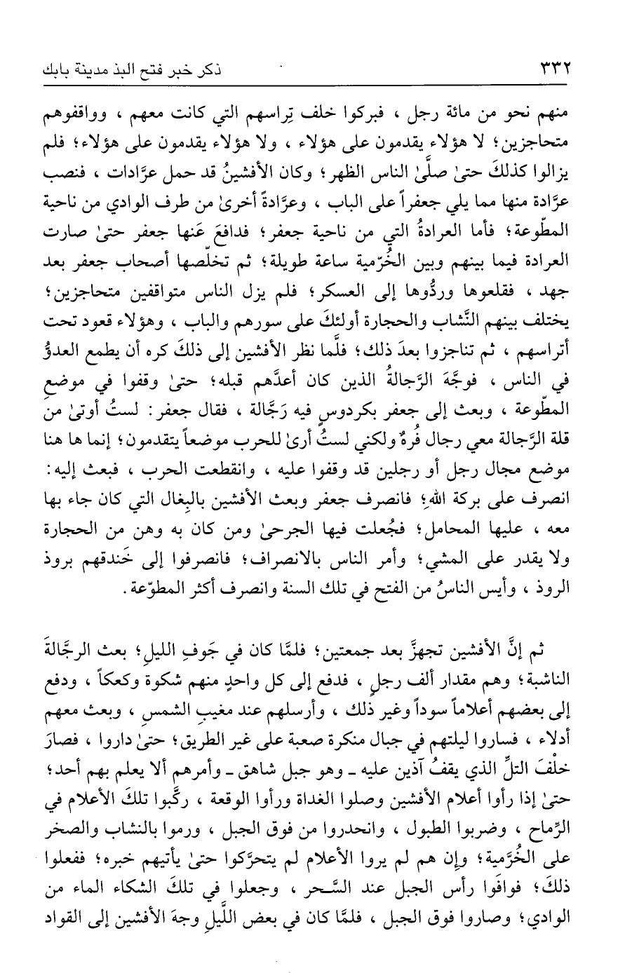 منهم نحو من مائة رجل، فبركوا خلف تِراسهم التي كانت معهم، وواقفوهم متحاجزين؛ لا هؤلاء يقدمون على هؤلاء، ولا هؤلاء يقدمون على هؤلاء؛ فلم يزالوا كذلكَ حتى صلَّى الناس الظهر؛ وكان الأفشينُ قد حمل عرَّادات، فنصب عرَّادة منها مما يلي جعفرًا على الباب، وعرَّادةً أخرى من طرف الوادي من ناحية المطّوعة؛ فأما العرادةُ التي من ناحية جعفر؛ فدافعَ عَنها جعفر حتى صارت العرادة فيما بينهم وبين الخُرّمية ساعة طويلة؛ ثم تخلّصها أصحاب جعفر بعد جهد، فقلعوها وردُّوها إلى العسكر؛ فلم يزل الناس متواقفين متحاجزين؛ يختلف بينهم النَّشاب والحجارة أولئكَ على سورهم والباب، وهؤلاء قعود تحت أتراسهم، ثم تناجزوا بعدَ ذلك، فلَّما نظر الأفشين إلى ذلكَ كره أن يطمع العدوُّ في الناس، فوجَّهَ الرَّجالةُ الذين كان أعدَّهم قبله، حتى وقفوا في موضعِ المطّوعة، وبعث إلى جعفر بكردوس فيه رَجَّالة، فقال جعفر: لستُ أوتى من قلة الرِّجالة معي رجال فُرهٌ ولكني لستُ أرى للحرب موضعًا يتقدمون؛ إنما ها هنا موضع مجال رجل أو رجلين قد وقفوا عليه، وانقطعت الحرب، فبعث إليه: انصرف على بركة الله؛ فانصرف جعفر وبعث الأفشين بالبِغال التي كان جاء بها معه، عليها المحامل؛ فجُعلت فيها الجرحى ومن كان به وهن من الحجارة ولا يقدر على المشي؛ وأمر الناس بالانصراف، فانصرفوا إلى خَندقهم بروذ الروذ، وأيس الناسُ من الفتح في تلك السنة وانصرف أكثر المطوّعة.