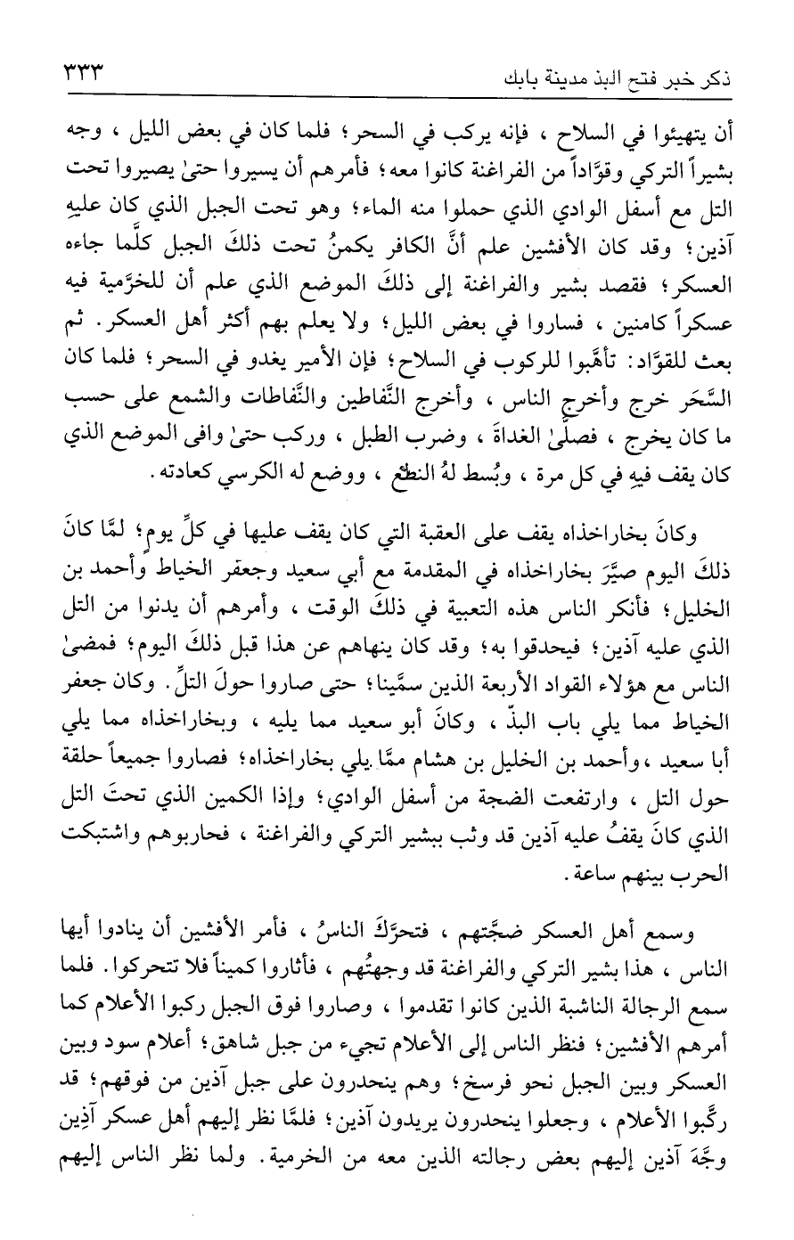 أن يتهيئوا في السلاح، فإنه يركب في السحر؛ فلما كان في بعض الليل، وجه بشيرًا التركي وقوَّادًا من الفراغنة كانوا معه؛ فأمرهم أن يسيروا حتى يصيروا تحت التل مع أسفل الوادي الذى حملوا منه الماء؛ وهو تحت الجبل الذي كان عليهِ آذين؛ وقد كان الأفشين علم أنَّ الكافر يكمنُ تحت ذلكَ الجبل كلَّما جاءه العسكر؛ فقصد بشير والفراغنة إلى ذلكَ الموضع الذي علم أن للخرَّمية فيه عسكرًا كامنين، فساروا في بعض الليل؛ ولا يعلم بهم أكثر أهل العسكر. ثم بعث للقؤَاد: تأهَّبوا للركوب في السلاح؛ فإن الأمير يغدو في السحر؛ فلما كان السَّحَر خرج وأخرج الناس، وأخرج النَّفاطين والنَّفاطات والشمع على حسب ما كان يخرج، فصلّى الغداةَ، وضرب الطبل، وركب حتى وافى الموضع الذي كان يقف فيهِ في كل مرة، وبُسط لهُ النطع، ووضع له الكرسي كعادته.