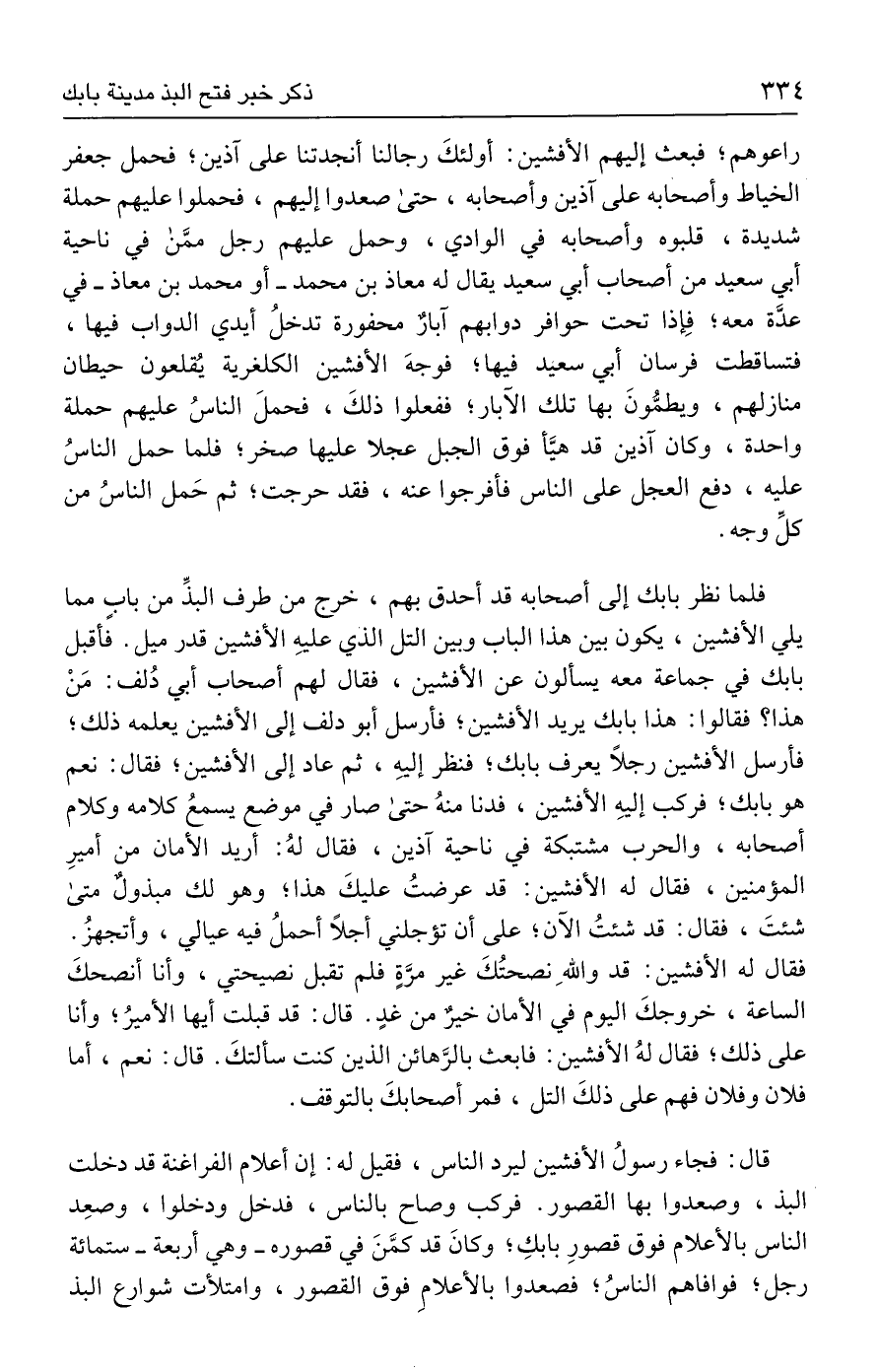 فلما نظر بابك إلى أصحابه قد أحدق بهم، خرج من طرف البذِّ من بابٍ مما يلي الأفشين، يكون بين هذا الباب وبين التل الذي عليهِ الأفشين قدر ميل. فأقبل بابك في جماعة معه يسألون عن الأفشين، فقال لهم أصحاب أبي دُلف: مَنْ هذا؟ فقالوا: هذا بابك يريد الأفشين؛ فأرسل أبو دلف إلى الأفشين يعلمه ذلك؛ فأرسل الأفشين رجلًا يعرف بابك؛ فنظر إليهِ، ثم عاد إلى الأفشين؛ فقال: نعم هو بابك؛ فركب إليهِ الأفشين، فدنا منهُ حتى صار في موضع يسمعُ كلامه وكلام أصحابه، والحرب مشتبكة في ناحية آذين، فقال لهُ: أريد الأمان من أميرِ المؤمنين، فقال له الأفشين: قد عرضتُ عليكَ هذا؛ وهو لك مبذولٌ متى شئتَ، فقال: قد شئتُ الآن؛ على أن تؤجلني أجلًا أحملُ فيه عيالي، وأتجهزُ. فقال له الأفشين: قد واللهِ نصحتُكَ غير مرَّةٍ فلم تقبل نصيحتي، وأنا أنصحكَ الساعة، خروجكَ اليوم في الأمان خيرٌ من غدٍ. قال: دد قبلت أيها الأميرُ؛ وأنا على ذلك؛ فقال لهُ الأفشين: فابعث بالرَّهائن الذين كنت سألتكَ. قال: نعم، أما فلان وفلان فهم على ذلكَ التل، فمر أصحابكَ بالتوقف.