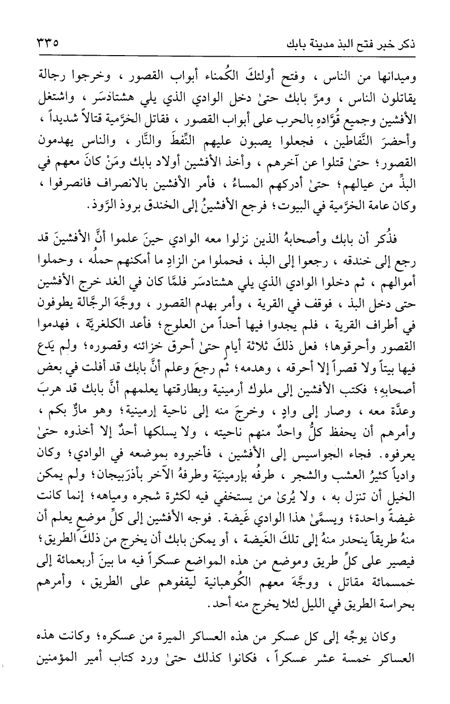 وميدانها من الناس، وفتح أولئكَ الكُمناء أبواب القصور، وخرجوا رجالة يقاتلون الناس، ومرَّ بابك حتى دخل الوادي الذي يلي هشتاذسَر، واشتغل الأفشين وجميع قُوَّادهِ بالحرب على أبواب القصور، فقاتل الخرَّمية قتالًا شديدًا، وأحضرَ النَّفاطين، فجعلوا يصبون عليهم النِّفطَ والنَّار، والناس يهدمون القصور؛ حتى قتلوا عن آخرهم، وأخذ الأفشين أولاد بابك ومَنْ كانَ معهم في البذِّ من عيالهم، حتى أدركهم المساءُ، فأمر الأفشين بالانصراف فانصرفوا، وكان عامة الخرَّمية في البيوت، فرجع الأفشينُ إلى الخندق بروذ الرَّوذ.