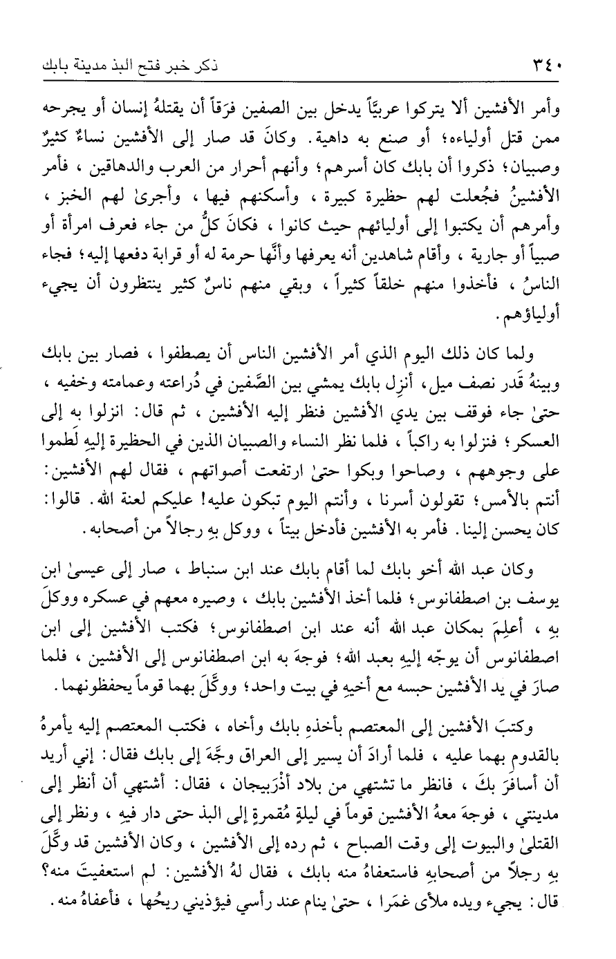 وأمر الأفشين ألا يتركوا عربيًّا يدخل بين الصفين فرَقًا أن يقتلهُ إنسان أو يجرحه ممن قتل أولياءه؛ أو صنع به داهية. وكانَ قد صار إلى الأفشين نساءٌ كثيرٌ وصبيان؛ ذكروا أن بابك كان أسرهم، وأنهم أحرار من العرب والدهاقين، فأمر الأفشينُ فجُعلت لهم حظيرة كبيرة، وأسكنهم فيها، وأجرى لهم الخبز، وأمرهم أن يكتبوا إلى أوليائهم حيث كانوا، فكانَ كلُّ من جاء فعرف امرأة أو صبيًا أو جارية، وأقام شاهدين أنه يعرفها وأنَّها حرمة له أو قرابة دفعها إليه؛ فجاء الناسُ، فأخذوا منهم خلقًا كثيرًا، وبقي منهم ناسٌ كثير ينتظرون أن يجيء أولياؤهم.