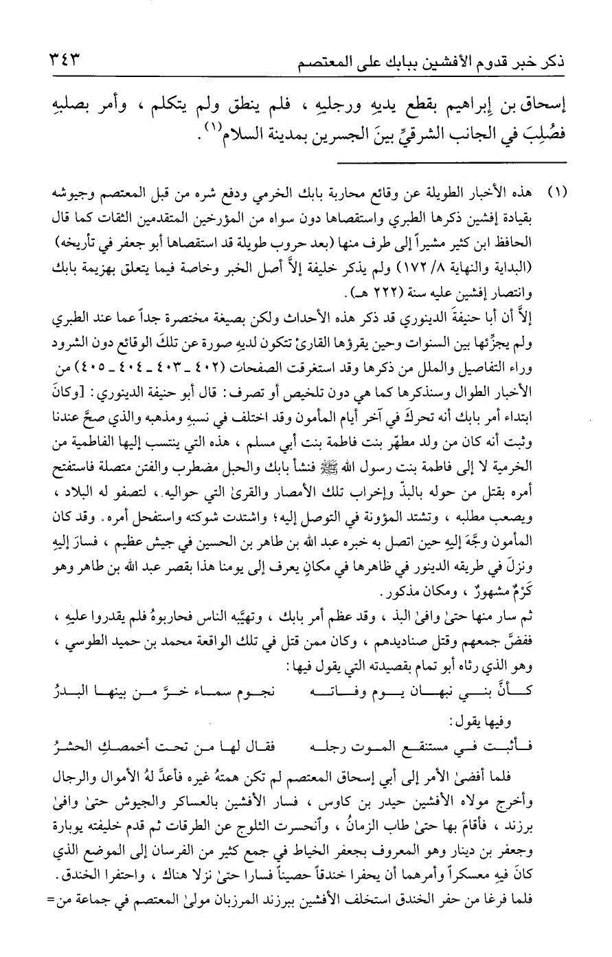 (١) هذه الأخبار الطويلة عن وقائع محاربة بابك الخرمي ودفع شره من قبل المعتصم وجيوشه بقيادة إفشين ذكرها الطبري واستقصاها دون سواه من المؤرخين المتقدمين الثقات كما قال الحافظ ابن كثير مشيرًا إلى طرف منها (بعد حروب طوية قد استقصاها أبو جعفر في تأريخه) (البداية والنهاية ٨/ ١٧٢) ولم يذكر خليفة إلَّا أصل الخبر وخاصة فيما يتعلق بهزيمة بابك وانتصار إفشين عليه سنة (٢٢٢ هـ).