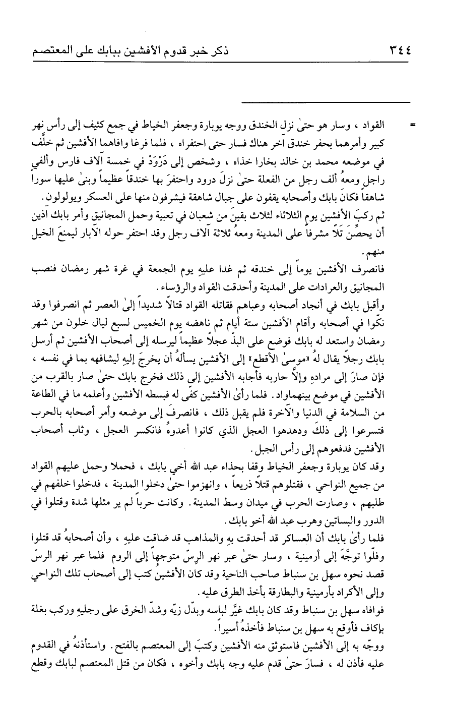 = القواد، وسار هو حتى نزل الخندق ووجه يوبارة وجعفر الخياط في جمع كثيف إلى رأس نهر كبير وأمرهما بحفر خندق آخر هناك فسار حتى احتفراه، فلما فرغا وافاهما الأفشين ثم خلَّف في موضعه محمد بن خالد بخارا خذاه، وشخص إلى دَرْوَدْ في خمسة آلاف فارس وألفي راجل ومعهُ ألف رجل من الفعلة حتى نزلَ درود واحتفرَ بها خندقًا عظيمًا وبنى عليها سورا شاهقا فكانَ بابك وأصحابه يقفون على جبال شاهقة فيشرفون منها على العسكر ويولولون. ثم ركبَ الأفشين يوم الثلاثاء لثلاث بقينَ من شعبان في تعبية وحمل المجانيق وأمر بابك آذين أن يحصِّنَ تَلًا مشرفًا على المدينة ومعهُ ثلاثة آلاف رجل وقد احتفر حوله الآبار ليمنعَ الخيل منهم.