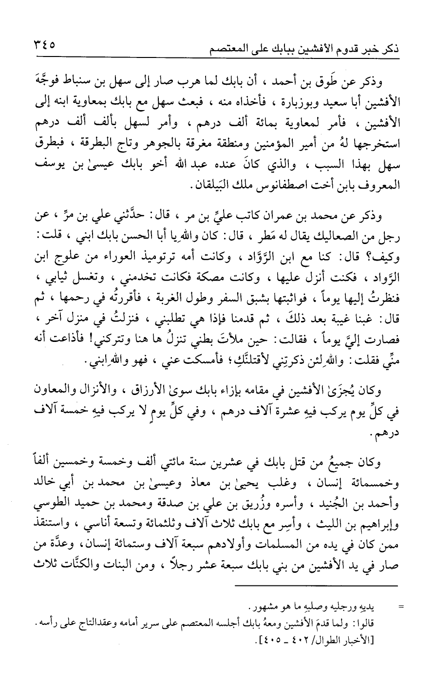 قالوا: ولما قدمَ الأفشين ومعهُ بابك أجلسه المعتصم على سرير أمامه وعقد التاج على رأسه. [الأخبار الطوال/ ٤٠٢ - ٤٠٥].