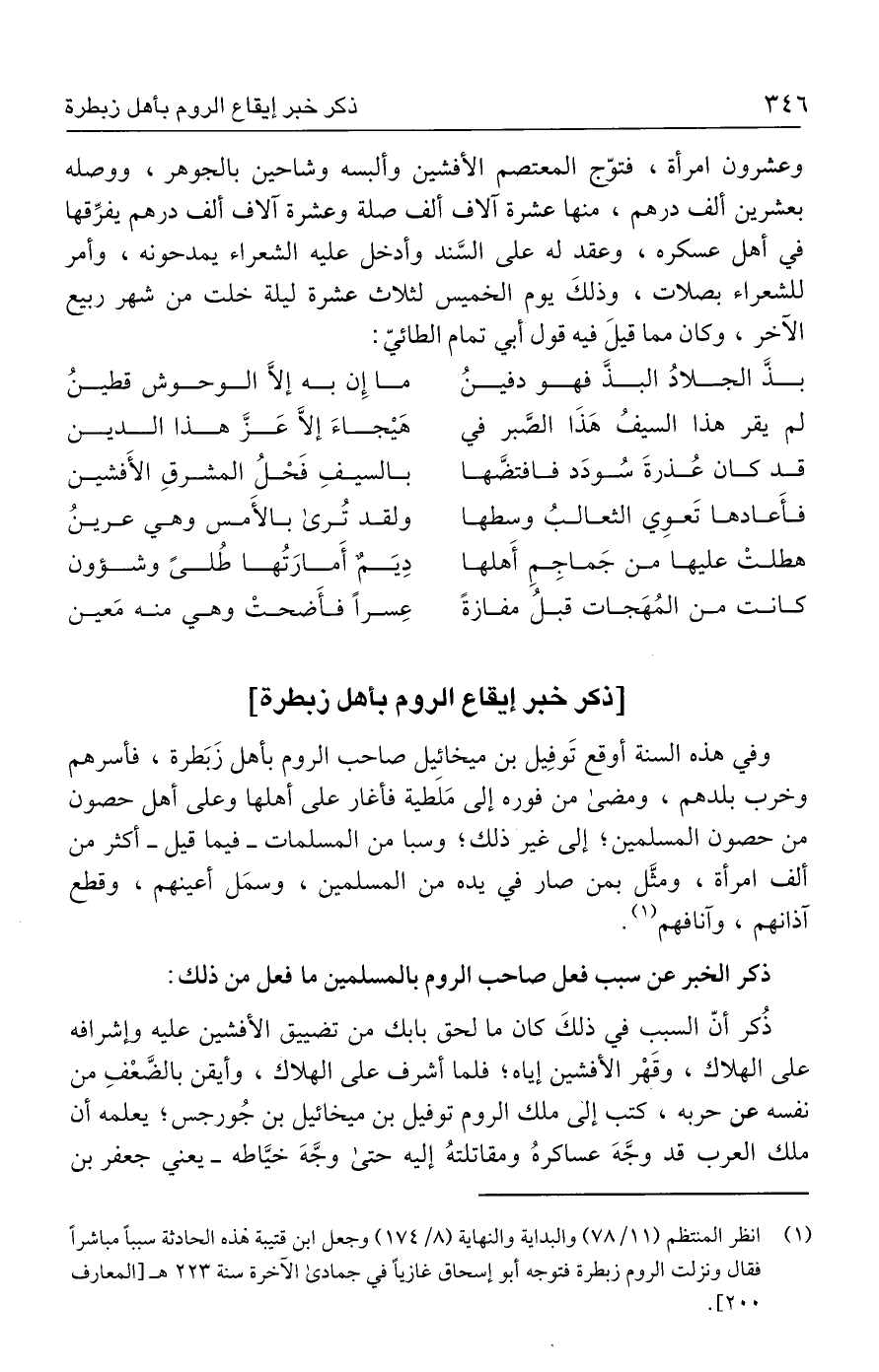 (١) انظر المنتظم (١١/ ٧٨) والبداية والنهاية (٨/ ١٧٤) وجعل ابن قتيبة هذه الحادثة سببًا مباشرًا فقال ونزلت الروم زبطرة فتوجه أبو إسحاق غازيًا في جمادى الآخرة سنة ٢٢٣ هـ[المعارف ٢٠٠].