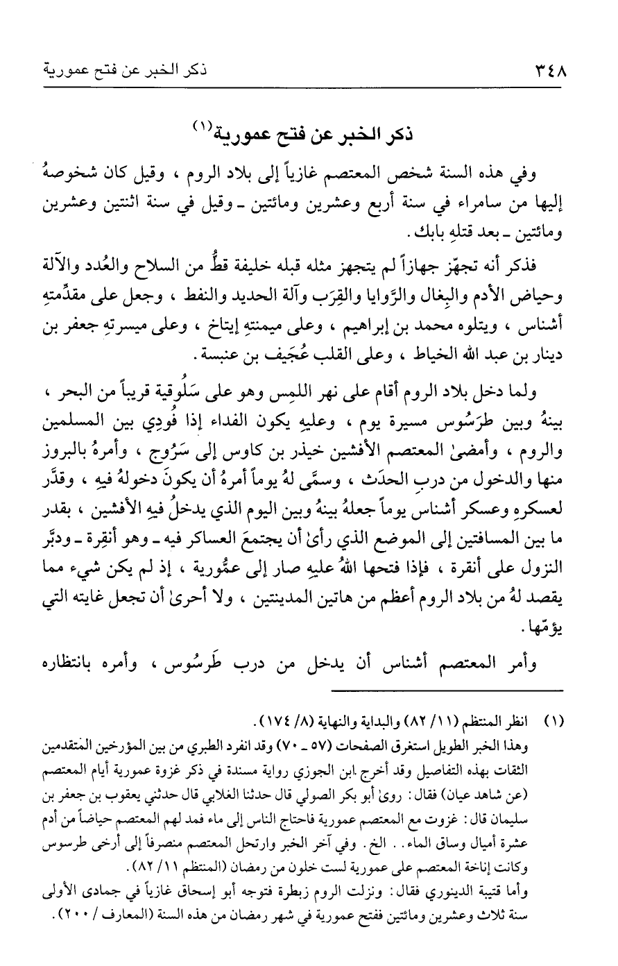 وهذا الخبر الطويل استغرق الصفحات (٥٧ - ٧٠) وقد انفرد الطبري من بين المؤرخين المتقدمين الثقات بهذه التفاصيل وقد أخرج ابن الجوزي رواية مسندة في ذكر غزوة عمورية أيام المعتصم (عن شاهد عيان) فقال: روى أبو بكر الصولي قال حدثنا الغلابي قال حدثني يعقوب بن جعفر بن سليمان قال: غزوت مع المعتصم عمورية فاحتاج الناس إلى ماء فمد لهم المعتصم حياضًا من أدم عشرة أميال وساق الماء. . الخ. وفي آخر الخبر وارتحل المعتصم منصرفًا إلى أرخى طرسوس وكانت إناخة المعتصم على عمورية لست خلون من رمضان (المنتظم ١١/ ٨٢).