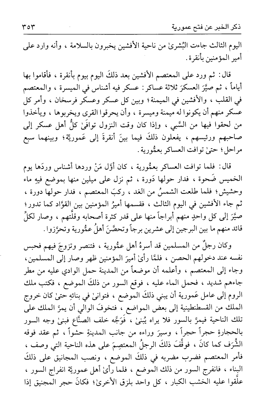 قال: ثم ورد على المعتصم الأفشين بعد ذلكَ اليوم بيوم بأنقرة، فأقاموا بها أيامًا، ثم صيَّرَ العسكرَ ثلاثة عساكر: عسكر فيه أشناس في الميسرة، والمعتصم في القلب، والأفشين في الميمنة؛ وبين كل عسكر وعسكر فرسخان، وأمر كل عسكر منهم أن يكونوا له ميمنة وميسرة، وأن يحرقوا القرى ويخربوها، ويأخذوا من لحقوا فيها من السَّبي، وإذا كان وقت النزول توافَى كلُّ أهل عسكر إلى صاحبهم ورئيسهم، يفعلون ذلكَ فيما بينَ أنقرةَ إلى عَموريَّة؛ وبينهما سبع مراحل؛ حتى توافت العساكر بعمُّورية.