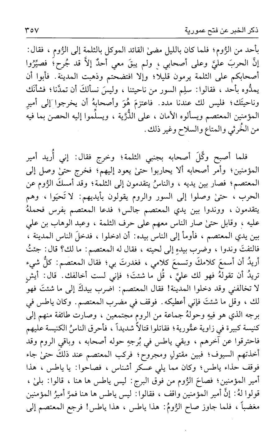 فلما أصبح وكَّلَ أصحابه بجنبي الثلمة؛ وخرج فقال: إني أُريد أمير المؤمنين؛ وأمر أصحابه ألا يحاربوا حتى يعود إليهم؛ فخرج حتى وصل إلى المعتصم؛ فصار بين يديه، والناسُ يتقدمون إلى الثلمة؛ وقد أمسكَ الرُّوم عن الحرب، حتى وصلوا إلى السور والروم يقولون بأيديهم: لا تَحيَوا، وهم يتقدمون، ووندوا بين يدي المعتصم جالس؛ فدعا المعتصم بفرس فحملهُ عليه، وقابل حتى صار الناس معهم على حرف الثلمة، وعبد الوهاب بن علي بين يدي المعتصم، فأومأ إلى الناس بيده: أن ادخلوا، فدخلَ الناس المدينة، فالتفتَ وندوا، وضرب بيدهِ إلى لحيته، فقال له المعتصم: ما لك؟ قال: جئتُ أريدُ أن أسمعَ كلامكَ وتسمعَ كلامي، فغدرتَ بي؛ فقال المعتصم: كلُّ شيء تريدُ أن تقولهُ فهو لك عليَّ، قُل ما شئتَ؛ فإني لست أخالفك. قال: أيشٍ لا تخالفني وقد دخلوا المدينة! فقال المعتصم: اضرب بيدكَ إلى ما شئتَ فهو لك، وقل ما شئتَ فإني أعطيكه. فوقف في مضرب المعتصم. وكان ياطس في برجه الذي هو فيهِ وحولهُ جماعة من الروم مجتمعين، وصارت طائفة منهم إلى كنيسة كبيرة في زاوية عمُّورية؛ فقاتلوا قتالًا شديدًا، فأحرق الناسُ الكنيسة عليهم فاحترقوا عن آخرهم، وبقي ياطس في بُرجهِ حوله أصحابه، وباقي الروم وقد أخذتهم السيوف؛ فبين مقتولٍ ومجروح؛ فركب المعتصم عند ذلكَ حتى جاء فوقف حذاء ياطس، وكان مما يلي عسكر أشناس، فصاحوا: يا ياطس، هذا أمير المؤمنين؛ فصاحَ الرُّوم من فوق البرج: ليس ياطس ها هنا، قالوا: بلى، قولوا لهُ: إنَّ أمير المؤمنين واقف، فقالوا: ليس ياطس ها هنا فمرَّ أميرُ المؤمنين مغضبًا، فلما جاوز صاح الرُّومُ: هذا ياطس، هذا ياطس! فرجع المعتصم إلى