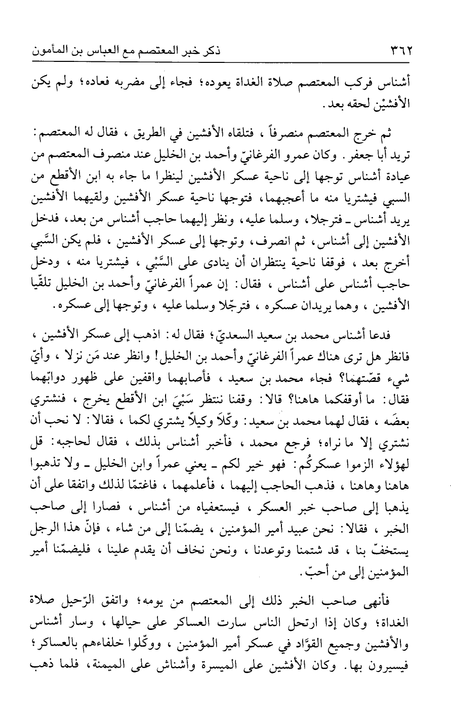 ثم خرج المعتصم منصرفًا، فتلقاه الأفشين في الطريق، فقال له المعتصم: تريد أبا جعفر. وكان عمرو الفرغانيّ وأحمد بن الخليل عند منصرف المعتصم من عيادة أشناس توجها إلى ناحية عسكر الأفشين لينظرا ما جاء به ابن الأقطع من السبي فيشتريا منه ما أعجبهما، فتوجها ناحية عسكر الأفشين ولقيهما الأفشين يريد أشناس - فترجلا، وسلما عليه، ونظر إليهما حاجب أشناس من بعد، فدخل الأفشين إلى أشناس، ثم انصرف، وتوجها إلى عسكر الأفشين، فلم يكن السَّبي أخرج بعد، فوقفا ناحية ينتظران أن ينادى على السَّبْي، فيشتريا منه، ودخل حاجب أشناس على أشناس، فقال: إن عمرًا الفرغانيّ وأحمد بن الخليل تلقّيا الأفشين، وهما يريدان عسكره، فترجّلا وسلما عليه، وتوجها إلى عسكره.