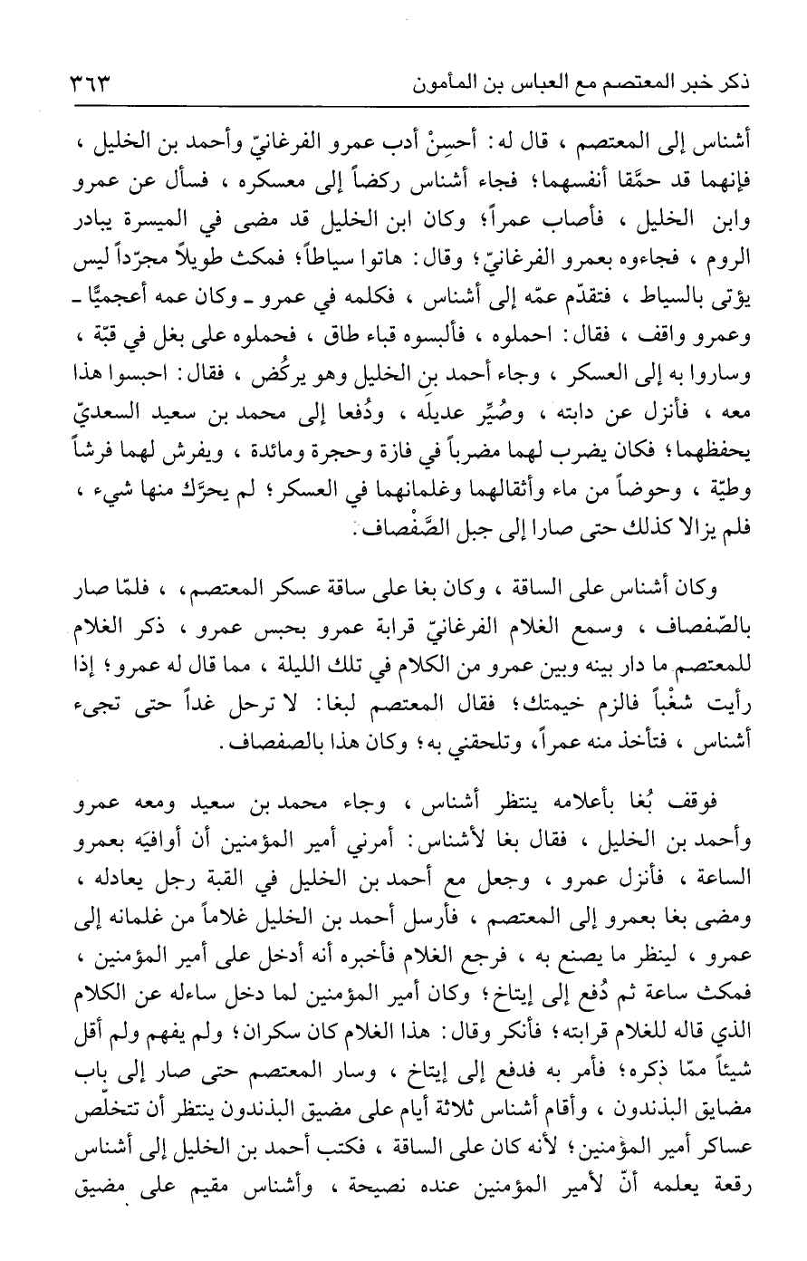 أشناس إلى المعتصم، قال له: أحسِنْ أدب عمرو الفرغانيّ وأحمد بن الخليل، فإنهما قد حمَّقا أنفسهما؛ فجاء أشناس ركضًا إلى معسكره، فسأل عن عمرو وابن الخليل، فأصاب عمرًا؛ وكان ابن الخليل قد مضى في الميسرة يبادر الروم، فجاءوه بعمرو الفرغانيّ؛ وقال: هاتوا سياطًا؛ فمكث طويلًا مجرّدًا ليس يؤتى بالسياط، فتقدّم عمّه إلى أشناس، فكلمه في عمرو - وكان عمه أعجميًّا - وعمرو واقف، فقال: احملوه، فألبسوه قباء طاق، فحملوه على بغل في قبّه، وساروا به إلى العسكر، وجاء أحمد بنِ الخليل وهو يركُض، فقال: احبسوا هذا معه، فأنزل عن دابته، وصُيِّر عديله، ودُفعا إلى محمد بن سعيد السعديّ يحفظهما؛ فكان يضرب لهما مضربًا في فازة وحجرة ومائدة، ويفرش لهما فرشًا وطيّة، وحوضًا من ماء وأثقالهما وغلمانهما في العسكر؛ لم يحرَّك منها شيء، فلم يزالا كذلك حتى صارا إلى جبل الصَّفْصاف.