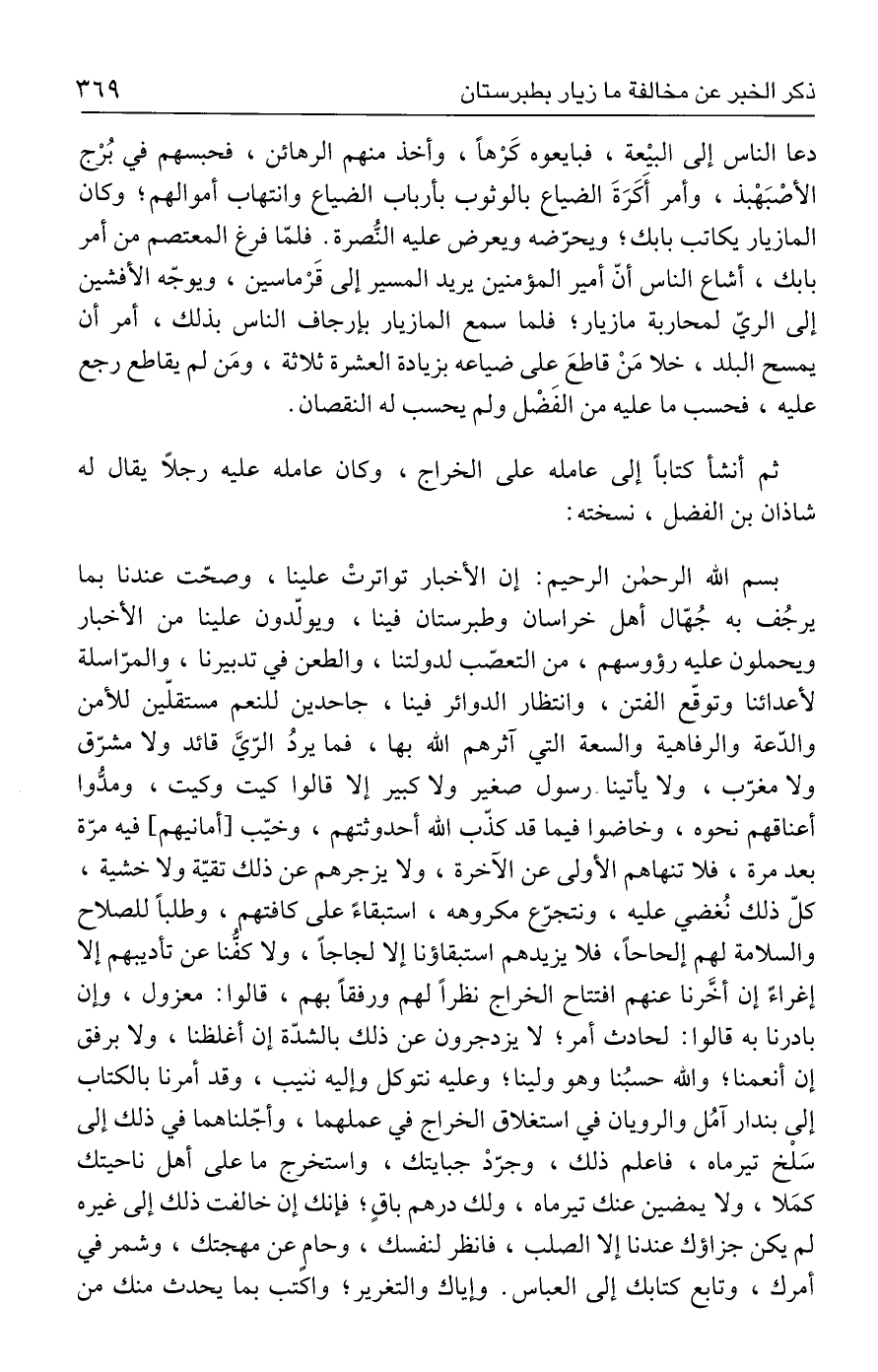 بسم الله الرحمن الرحيم: إن الأخبار تواترتْ علينا، وصحّت عندنا بما يرجُف به جُهّال أهل خراسان وطبرستان فينا، ويولّدون علينا من الأخبار ويحملون عليه رؤوسهم، من التعصّب لدولتنا، والطعن في تدبيرنا، والمرّاسلة لأعدائنا وتوقّع الفتن، وانتظار الدوائر فينا، جاحدين للنعم مستقلّين للأمن والدّعة والرفاهية والسعة التي آثرهم الله بها، فما يردُ الرّيَّ قائد ولا مشرّق ولا مغرّب، ولا يأتينا رسول صغير ولا كبير إلا قالوا كيت وكيت، ومدُّوا أعناقهم نحوه، وخاضوا فيما قد كذّب الله أحدوثتهم، وخيّب [أمانيهم] فيه مرّة بعد مرة، فلا تنهاهم الأولى عن الآخرة، ولا يزجرهم عن ذلك تقيّة ولا خشية، كلّ ذلك نُغضي عليه، ونتجرّع مكروهه، استبقاءً على كافتهم، وطلبًا للصلاح والسلامة لهم إلحاحًا، فلا يزيدهم استبقاؤنا إلا لجاجًا، ولا كفُنا عن تأديبهم إلا إغراءً إن أخَّرنا عنهم افتتاح الخراج نظرًا لهم ورفقًا بهم، قالوا: معزول، وإن بادرنا به قالوا: لحادث أمر؛ لا يزدجرون عن ذلك بالشدّة إن أغلظنا، ولا برفق إن أنعمنا؛ والله حسبُنا وهو ولينا؛ وعليه نتوكل وإليه ننيب، وقد أمرنا بالكتاب إلى بندار آمُل والرويان في استغلاق الخراج في عملهما، وأجّلناهما في ذلك إلى سَلْخ تيرماه، فاعلم ذلك، وجرّدْ جبايتك، واستخرج ما على أهل ناحيتك كمَلا، ولا يمضين عنك تيرماه، ولك درهم باقٍ؛ فإنك إن خالفت ذلك إلى غيره لم يكن جزاؤك عندنا إلا الصلب، فانظر لنفسك، وحامٍ عن مهجتك، وشمر في أمرك، وتابع كتابك إلى العباس. وإياك والتغرير؛ واكتب بما يحدث منك من