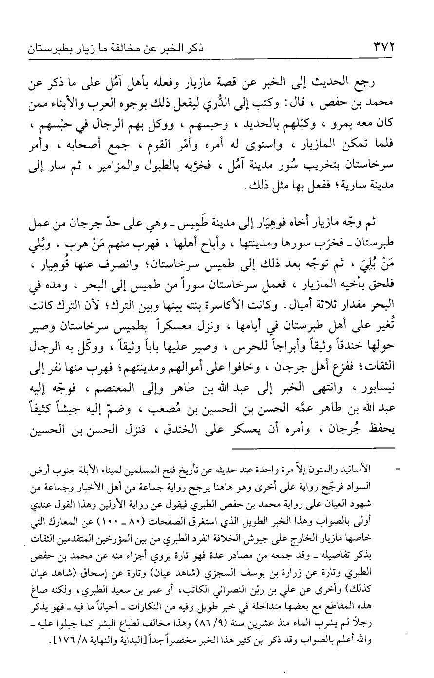 = الأسانيد والمتون إلّا مرة واحدة عند حديثه عن تأريخ فتح المسلمين لميناء الأبلة جنوب أرض السواد فرجّح رواية على أخرى وهو هاهنا يرجح رواية جماعة من أهل الأخبار وجماعة من شهود العيان على رواية محمد بن حفص الطبري فيقول عن رواية الأولين وهذا القول عندي أولى بالصواب وهذا الخبر الطويل الذي استغرق الصفحات (٨٠ - ١٠٠) عن المعارك التي خاضها مازيار الخارج على جيوش الخلافة انفرد الطبري من بين المؤرخين المتقدمين الثقات بذكر تفاصيله - وقد جمعه من مصادر عدة فهو تارة يروي أجزاء منه عن محمد بن حفص الطبري وتارة عن زرارة بن يوسف السجزي (شاهد عيان) وتارة عن إسحاق (شاهد عيان كذلك) وأخرى عن علي بن ربّن النصراني الكاتب، أو عمر بن سعيد الطبري، ولكنه صاغ هذه المقاطع مع بعضها متداخلة في خبر طويل وفيه من النكارات - أحيانًا ما فيه - فهو يذكر رجلًا لم يشرب الماء منذ عشرين سنة (٩/ ٨٦) وهذا مخالف لطباع البشر كما جبلوا عليه - والله أعلم بالصواب وقد ذكر ابن كثير هذا الخبر مختصرًا جدًّا [البداية والنهاية ٨/ ١٧٦].