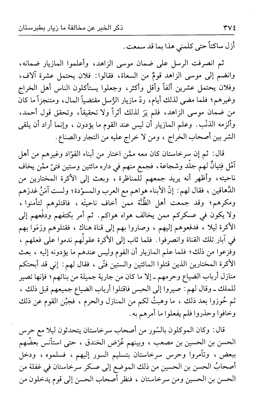 قال: ثم إن سرخاستان كان معه ممَّن اختار من أبناء القوّاد وغيرهم من أهل آمُل فِتيانٌ لهم جلّد وشجاعة، فجمع منهم في داره مائتين وستين فتىً ممَّن يخاف ناحيته، وأظهر أنه يريد جمعهم للمناظرة، وبعث إلى الأكرة المختارين من الدَّهاقين، فقال لهم: إنّ الأبناء هواهم مع العرب والمسؤدة؛ ولست آمَنُ غدرَهم ومكرهم؛ وقد جمعت أهل الظِّنَّة ممن أخاف ناحيتَه، فاقتلوهم لتأمنوا، ولا يكون في عسكركم ممن يخالف هواه هواكم. ثم أمر بكتفهم ودفْعهم إلى الأكرة ليلا، فدفعوهم إليهم، وصاروا بهم إلى قناة هناك، فقتلوهم ورَمَوا بهم في آبار تلك القناة وانصرفوا. فلما ثاب إلى الأكرة عقولُهم ندموا على فعلهم، وفزعوا من ذلك؛ فلما علم المازيار أن القوم وليس عندهم ما يؤدونه إليه، بعث الأكرة المختارين الذين قتلوا المائتين والستين فتًى، فقال لهم: إني قد أبحتكم منازل أرباب الضياع وحرمهم - إلا ما كان من جارية جميلة من بناتهم؛ فإنها تصير للملك - وقال لهم: صيروا إلى الحبس فاقتلوا أرباب الضياع جميعهم قبل ذلك، ثم حُوزوا بعد ذلك، ما وهبتُ لكم من المنازل والحرم، فجبُن القوم عن ذلك وخافوا وحذروا فلم يفعلوا ما أمرهم به.