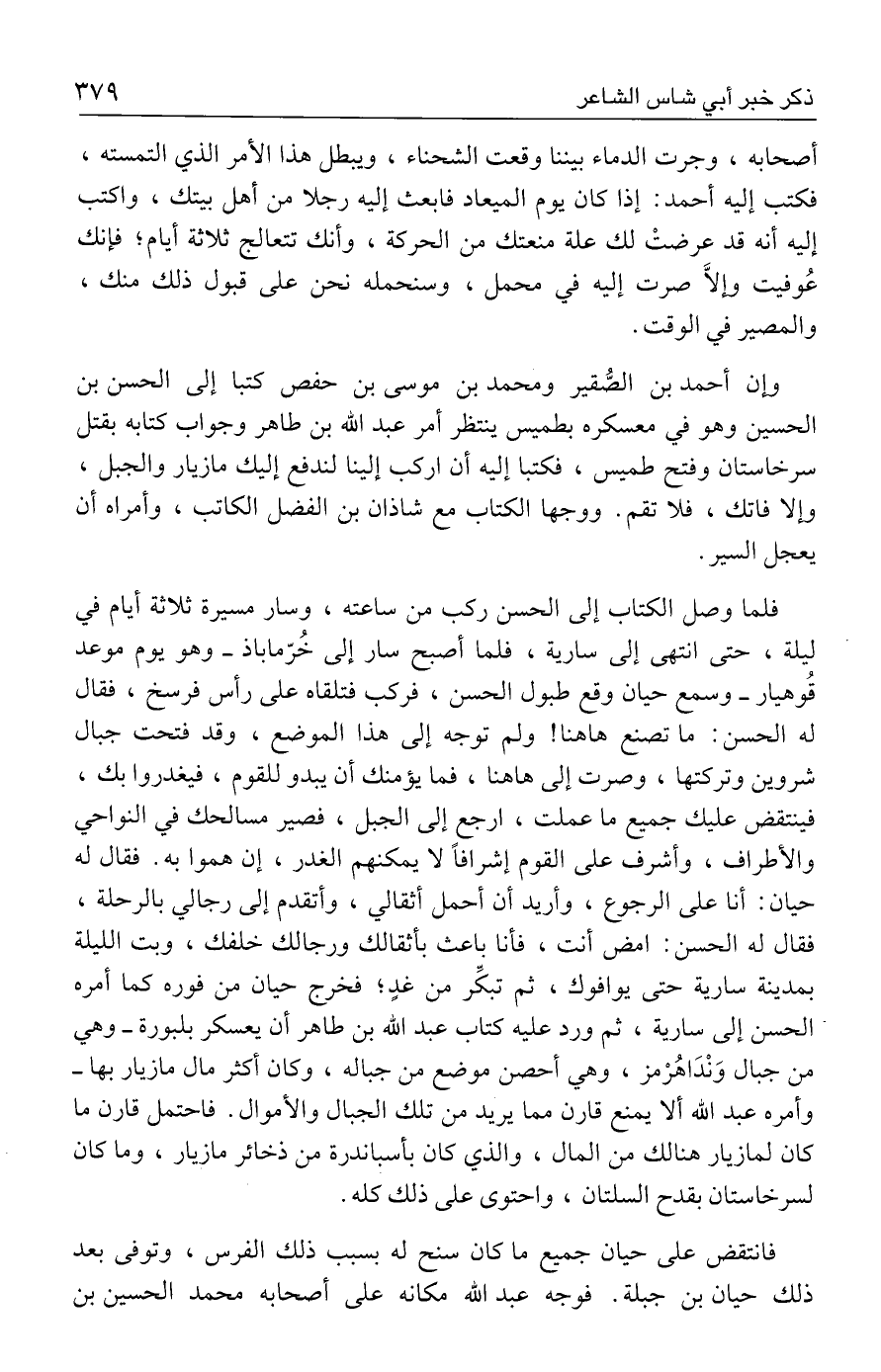 وإن أحمد بن الصُّقير ومحمد بن موسى بن حفص كتبا إلى الحسن بن الحسين وهو في معسكره بطميس ينتظر أمر عبد الله بن طاهر وجواب كتابه بقتل سرخاستان وفتح طميس، فكتبا إليه أن اركب إلينا لندفع إليك مازيار والجبل، وإلا فاتك، فلا تقم. ووجها الكتاب مع شاذان بن الفضل الكاتب، وأمراه أن يعجل السير.