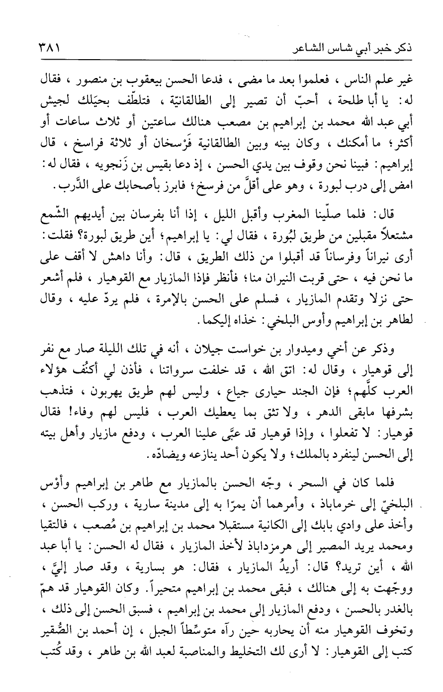 غير علم الناس، فعلموا بعد ما مضى، فدعا الحسن بيعقوب بن منصور، فقال له: يا أبا طلحة، أحبّ أن تصير إلى الطالقانيّة، فتلطّف بحيَلك لجيش أبي عبد الله محمد بن إبراهيم بن مصعب هنالك ساعتين أو ثلاث ساعات أو أكثر؛ ما أمكنك، وكان بينه وبين الطالقانية فَرْسخان أو ثلاثة فراسخ، قال إبراهيم: فبينا نحن وقوف بين يدي الحسن، إذ دعا بقيس بن زَنجويه، فقال له: امض إلى درب لبورة، وهو على أقلَّ من فرسخ، فابرز بأصحابك على الدَّرب.