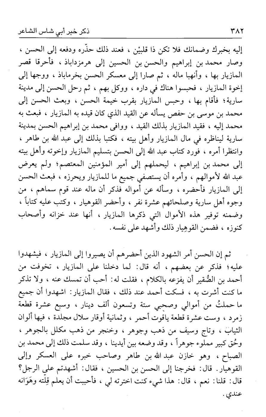 ثم إن الحسن أمر الشهود الذين أحضرهم أن يصيروا إلى المازيار، فيشهدوا عليه؛ فذكر عن بعضهم، أنه قال: لما دخلنا على المازيار، تخوفت من أحمد بن الصُّقير أن يفزعه بالكلام، فقلت له: أحب أن تمسك عنه، ولا تذكر ما كنت أشرت به، فسكت أحمد عند ذلك، فقال المازيار: اشهدوا أن جميع ما حملتُ من أموالي وصجبي ستة وتسعون ألف دينار، وسبع عشرة قطعة زمرد، وست عشرة قطعة ياقوت أحمر، وثمانية أوقار سلال مجلدة، فيها ألوان الثياب، وتاج وسيف من ذهب وجوهر، وخنجر من ذهب مكلل بالجوهر، وحُق كبير مملوء جوهرًا، وقد وضعه بين أيدينا، وقد سلمت ذلك إلى محمد بن الصباح، وهو خازن عبد الله بن طاهر وصاحب خبره على العسكر وإلى القوهيار. قال: فخرجنا إلى الحسن بن الحسين، فقال: أشهدتم على الرجل؟ قال: قلنا: نعم، قال: هذا شيء كنت اخترته لي، فأحببت أن يعلم قِلّته وهَوَانه عندي.