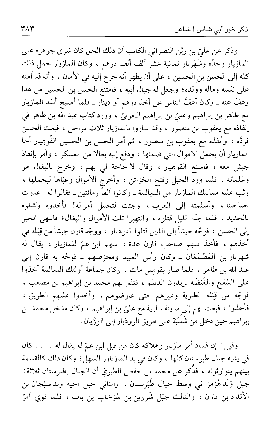 وقيل: إن فساد أمر مازيار وهلاكه كان من قبل ابن عمّ له يقال له .... كان في يديه جبال طبرستان كلها، وكان في يد المازيارر السهل؛ وكان ذلك كالقسمة بينهم يتوارثونه، فذُكر عن محمد بن حفص الطبريّ أن الجبالى بطبرستان ثلاثة: جبل وَنْداهُرْمز في وسط جبال طَبَرستان، والثاني جبل أخيه ونداسبْجان بن الأنداد بن قارن، والثالث جبَل شَرْوين بن سُرْخاب بن باب، فلما قوي أمرُ