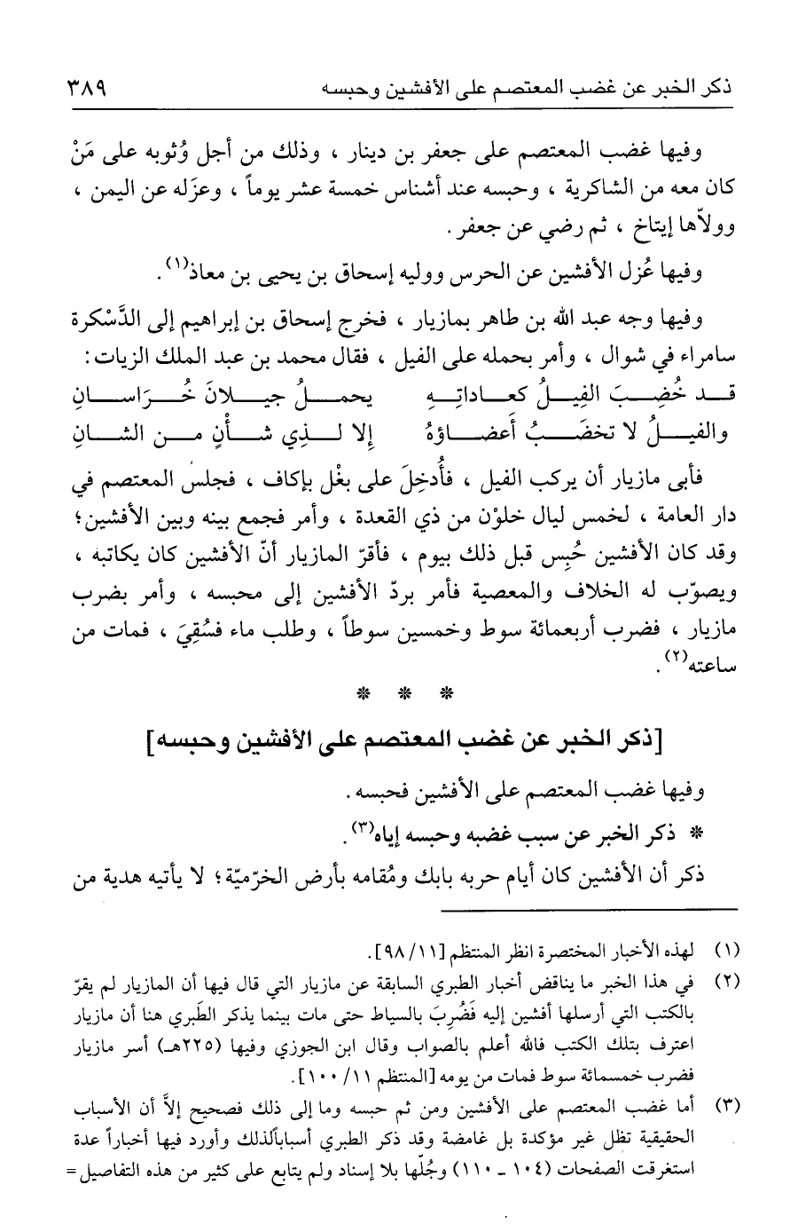 (٣) أما غضب المعتصم على الأفشين ومن ثم حبسه وما إلى ذلك فصحيح إلَّا أن الأسباب الحقيقية تظل غير مؤكدة بل غامضة وقد ذكر الطبري أسبابًا لذلك وأورد فيها أخبارًا عدة استغرقت الصفحات (١٠٤ - ١١٠) وجُلّها بلا إسناد ولم يتابع على كثير من هذه التفاصيل =