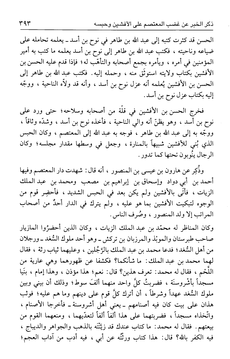 وكان المناظر له محمّد بن عبد الملك الزيات، وكان الذين أحضرُوا المازيار صاحب طبرستان والموبْذ والمرزبان بن تركش - وهو أحد ملوك السُّغد - ورجلان من أهل السُّغد؛ فدعا محمد بن عبد الملك بالرَّجُلين، وعليهما ثياب رثة، فقال لهما محمد بن عبد الملك: ما شأنكما؟ فكشفا عن ظهورهما وهي عارية من اللَّحْم، فقال له محمد: تعرف هذين؟ قال: نعم؛ هذا مؤذن، وهذا إمام، بنَيا مسجدًا بأشْروسنَة، فضربتُ كلَّ واحد منهما ألفَ سوط؛ وذلك أن بيني وبين ملوك السُّغد عهدًا وشرطًا، أن أترك كلَّ قوم على دينهم وما هم عليه؛ فوثب هذان على بيت كان فيه أصنامهم - يعني أهل أشروسنة - فأخرجا الأصنام، واتّخذاه مسجدًا، فضربتهما على هذا ألفًا ألفًا لتعدّيهما، ومنعهما القوم من بيعتهم. فقال له محمد: ما كتاب عندك قد زيَّنْتَه بالذهب والجواهر والديباج، فيه الكفر بالله؟ قال: هذا كتاب ورثْتُه عن أبي، فيه أدب من آداب العجم؛