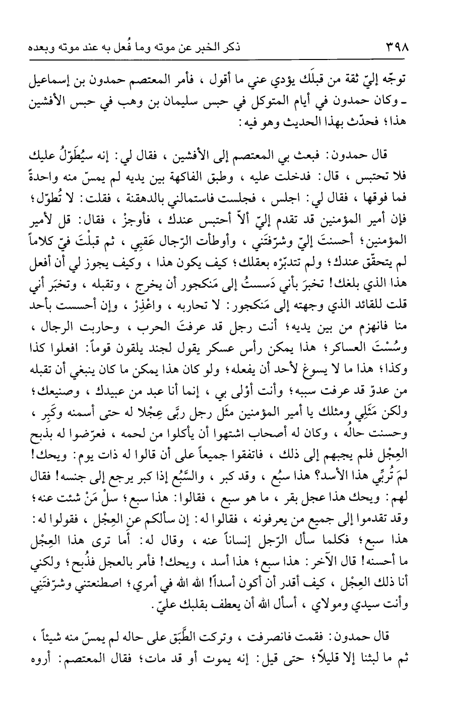 توجّه إليّ ثقة من قبلَك يؤدي عني ما أقول، فأمر المعتصم حمدون بن إسماعيل - وكان حمدون في أيام المتوكل في حبس سليمان بن وهب في حبس الأفشين هذا؛ فحدّث بهذا الحديث وهو فيه: