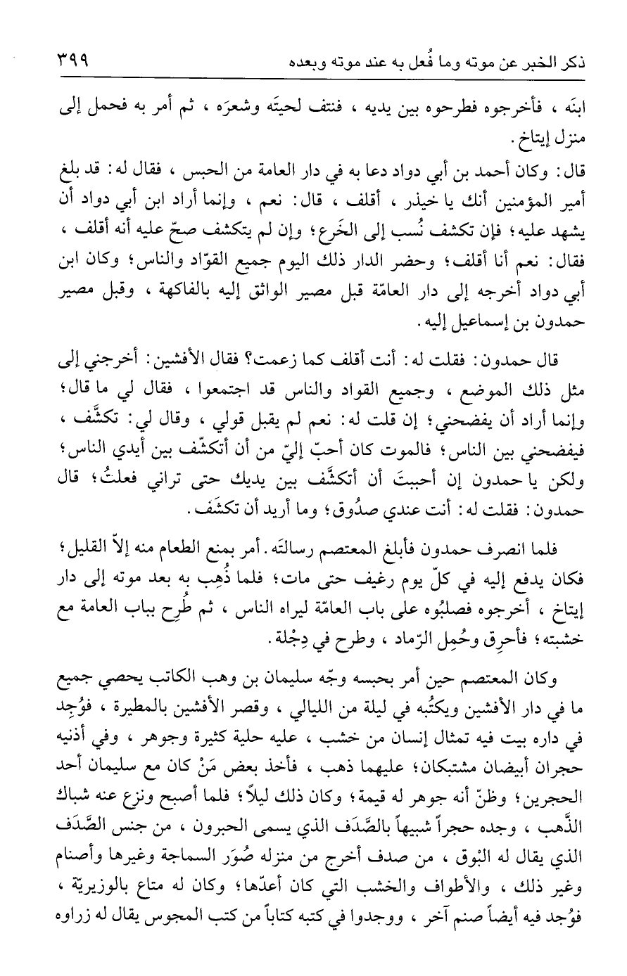 قال حمدون: فقلت له: أنت أقلف كما زعمت؟ فقال الأفشين: أخرجني إلى مثل ذلك الموضع، وجميع القواد والناس قد اجتمعوا، فقال لي ما قال؛ وإنما أراد أن يفضحني؛ إن قلت له: نعم لم يقبل قولي، وقال لي: تكشَّف، فيفضحني بين الناس؛ فالموت كان أحبّ إليّ من أن أتكشّف بين أيدي الناس؛ ولكن يا حمدون إن أحببتَ أن أتكشَّف بين يديك حتى تراني فعلتُ؛ قال حمدون: فقلت له: أنت عندي صدُوق، وما أريد أن تكشَف.